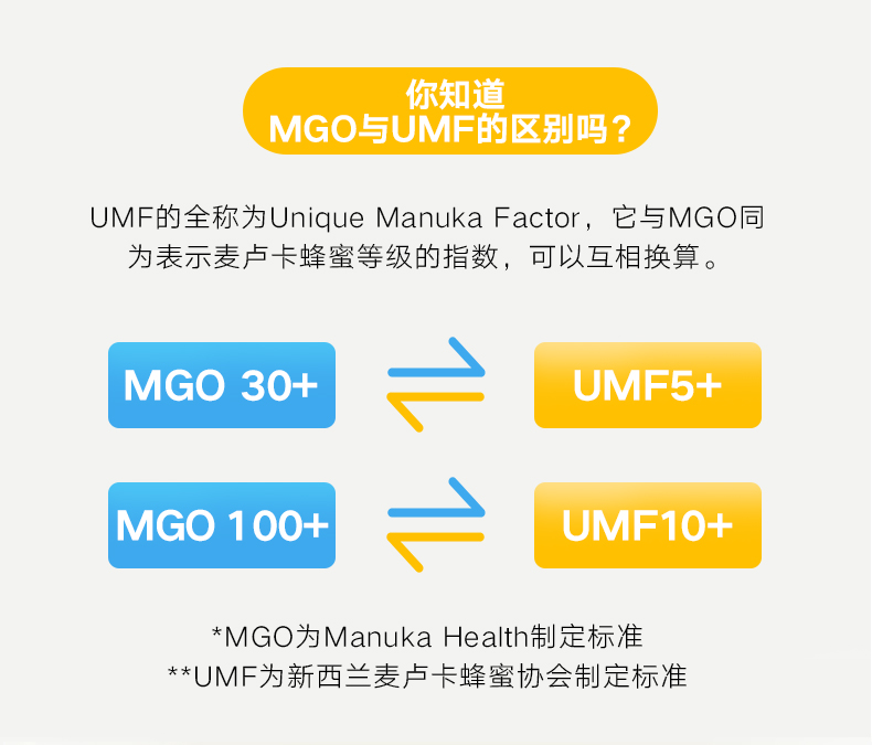 麦卢卡蜂蜜的品质,用MGO或UMF表示,分为五个等级:MGO 30+(UMF 5+)、MGO 100+(UMF 10+)、MGO 250+(UMF 15+)、MGO 400+(UMF 20+)、MGO 550+(UMF 25+),数字越大越好。其中400+以上的麦卢卡蜂蜜,又被称为可以喝的“消毒水”。(UMF为综合数值,MGO算是其中一项)