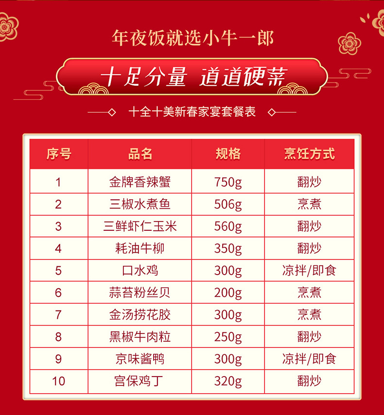 这款小牛一郎十道年夜饭,精选食材搭配,包含:宫保鸡丁、京酱肉丝、水煮鱼、酸汤肥牛、牛排、酱爆三鲜、松仁玉米、孜然牛肉粒、夫妻肺片、鸡脆骨。免洗免切免腌制,国家高级烹调技师操刀,分量十足,全程冷链配送,品质保险包装,团圆家宴,让相聚有期待。