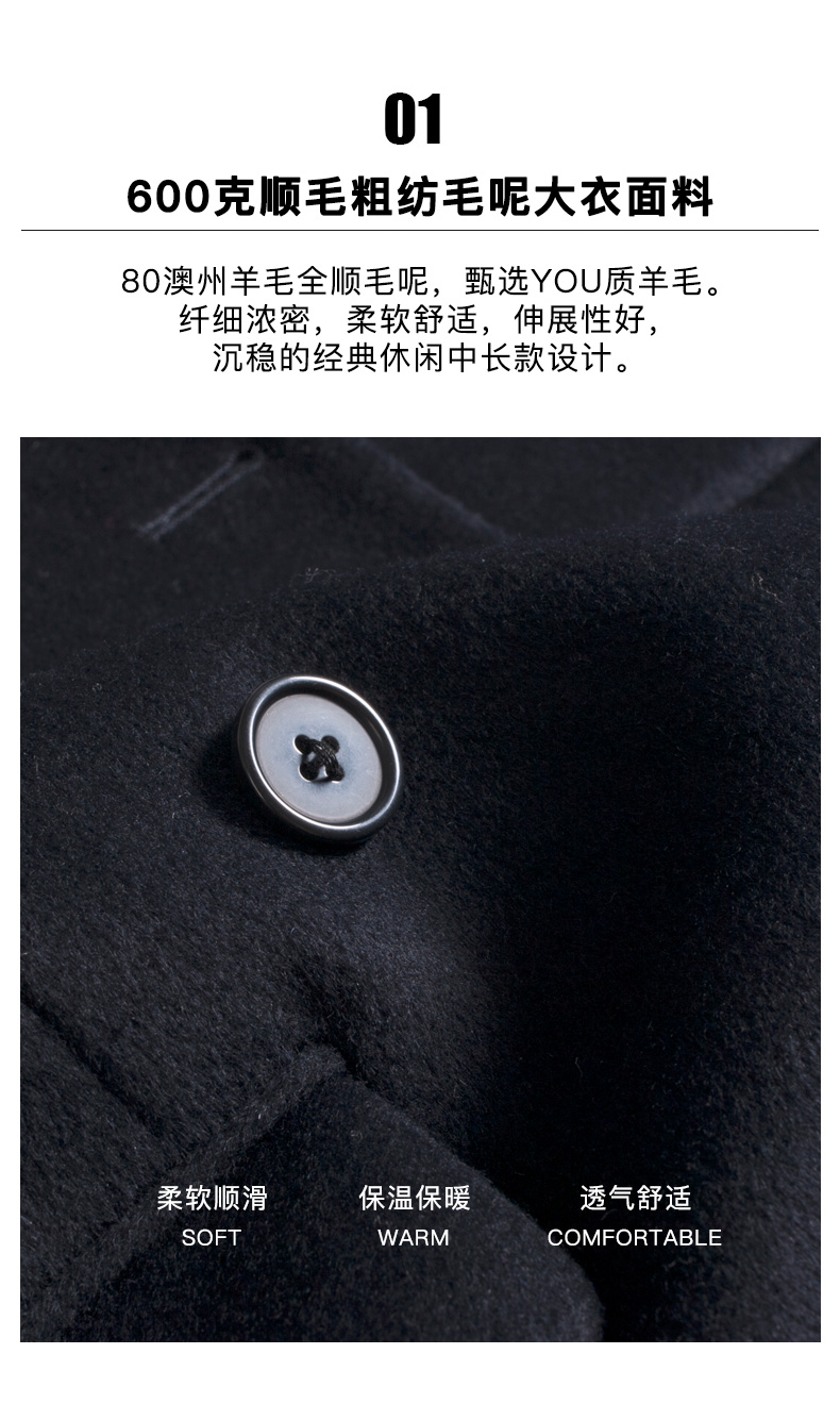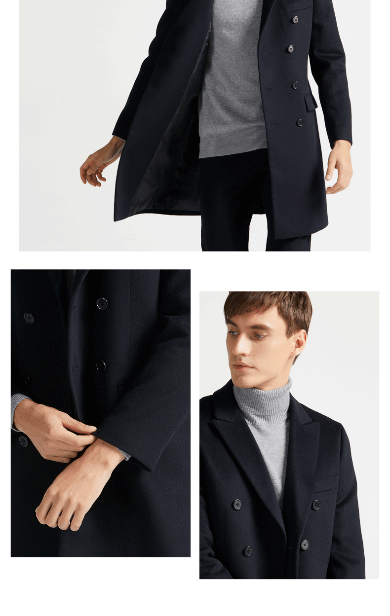 用到西装类商品的顶尖“归、拔”工艺,保证了大衣挺括,却不僵硬。款式上更接近风衣的设计,略修身的中长款版型设计,拉长身形、上身显瘦显高,像西服一样的戗驳领,双排扣,搭配高领衫一起穿,造型感十足,商务/休闲场合都合适。