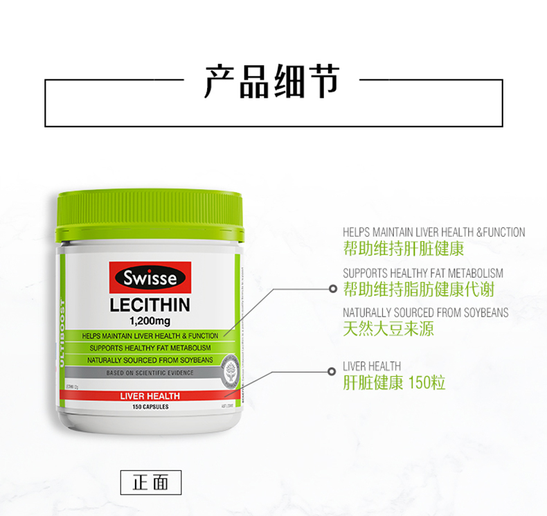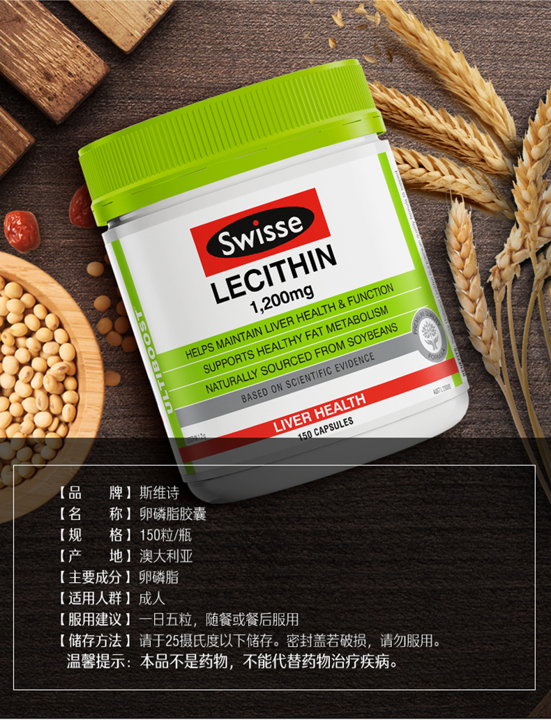 这款 Swisse 大豆卵磷脂胶囊 ,澳洲进口,大豆卵磷脂(Lecithin又称大豆蛋黄素)含有卵磷脂、脑磷脂、心磷脂、磷脂酸(PA)、磷脂酰甘油(PG)、缩醛磷脂、溶血磷脂等。具有保护肝脏、延缓衰老、预防心脑血管疾病等作用。