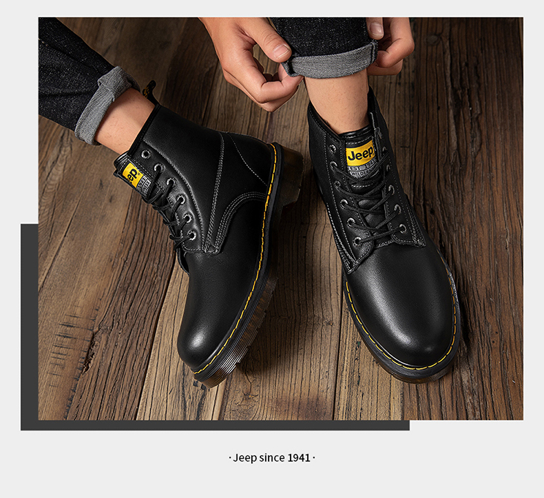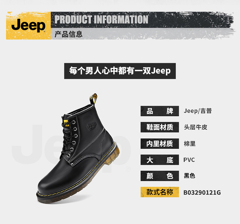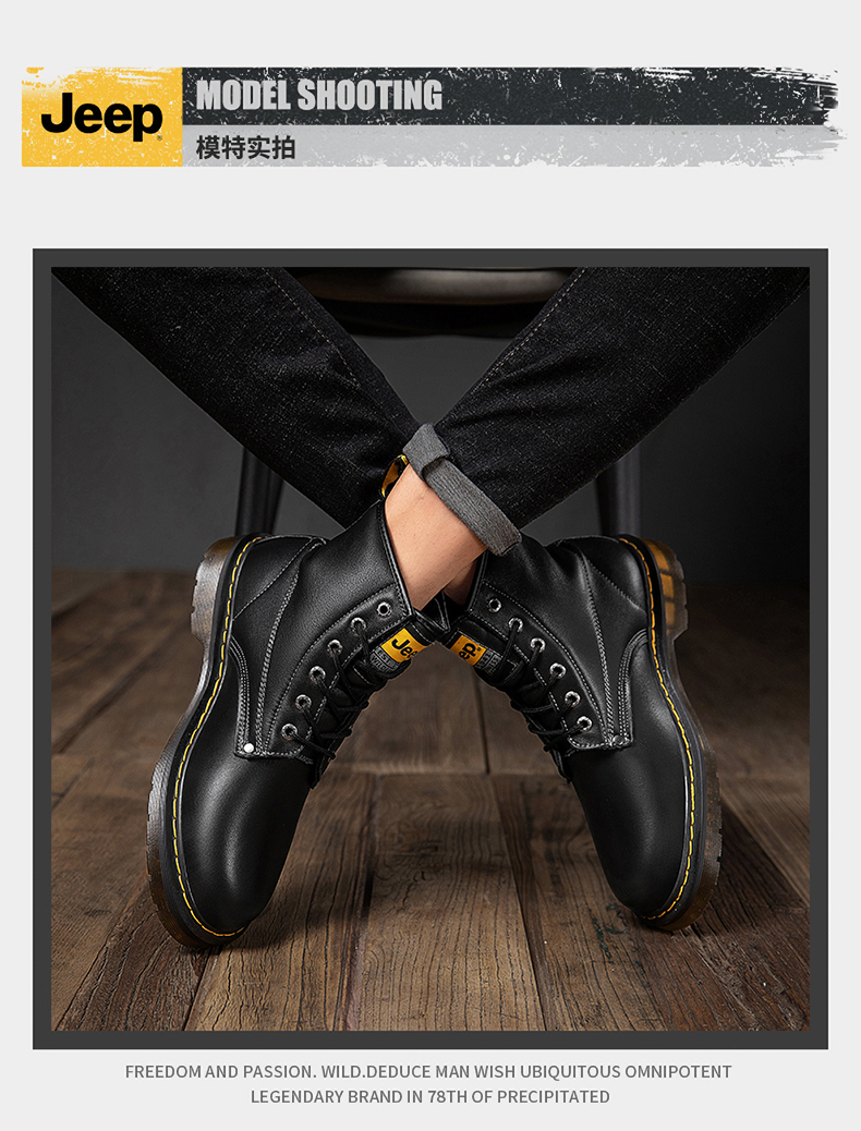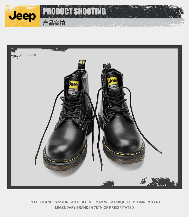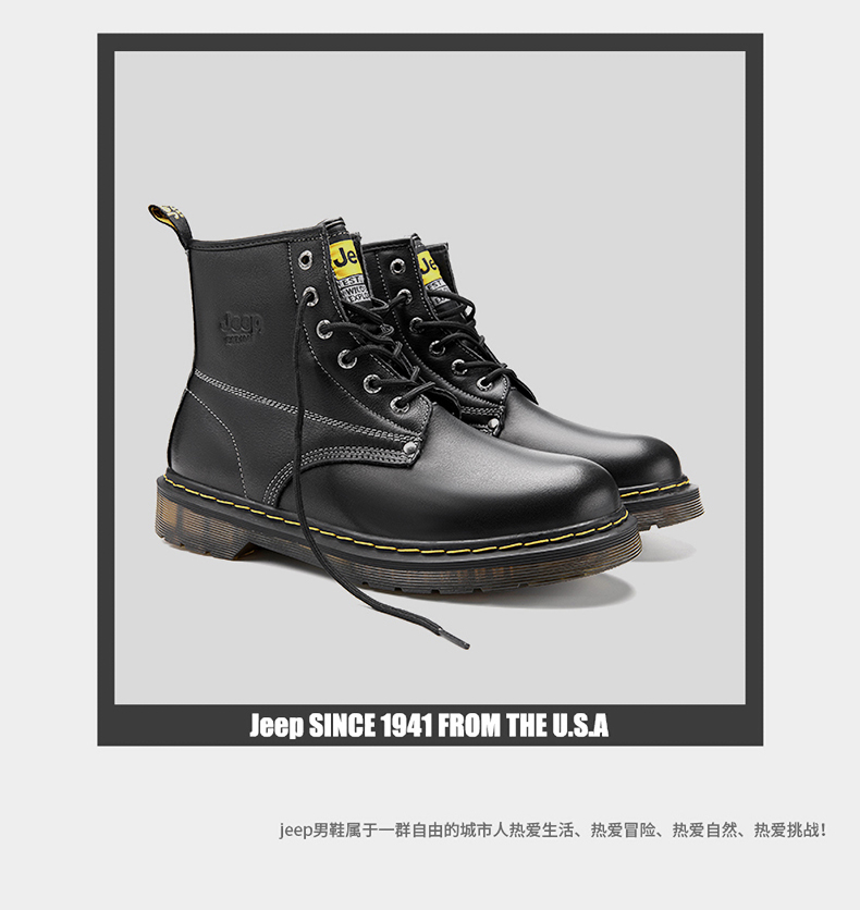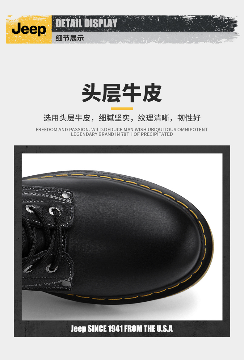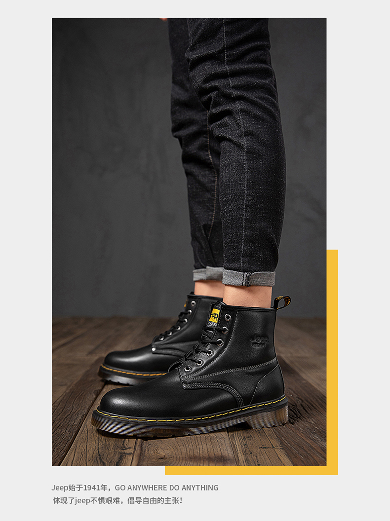 这款Jeep英伦风高帮真皮男靴,款式上是6孔工装马丁靴,非常帅气逼人,鞋面是头层牛皮制成,摸着手感舒适,光泽感强。加厚PVC防滑外底,抓地力强,支撑性好,还能增高。