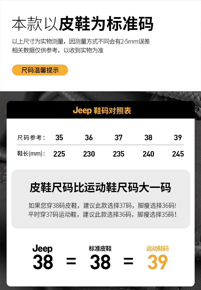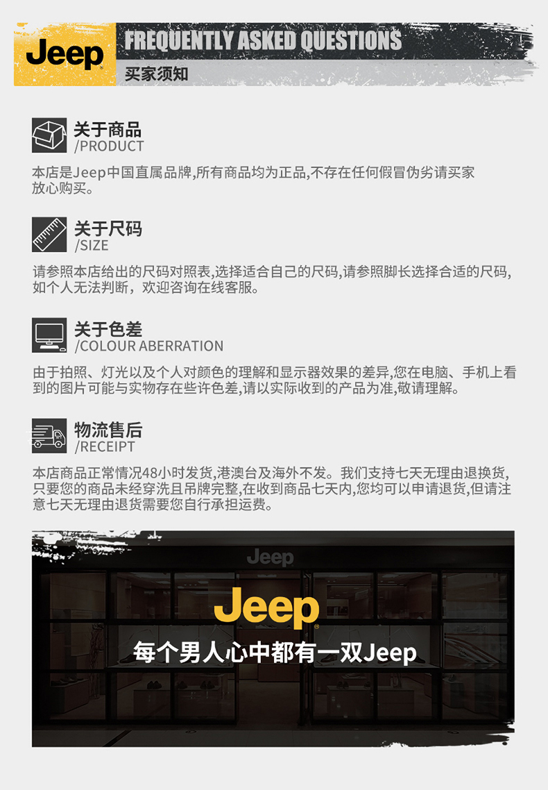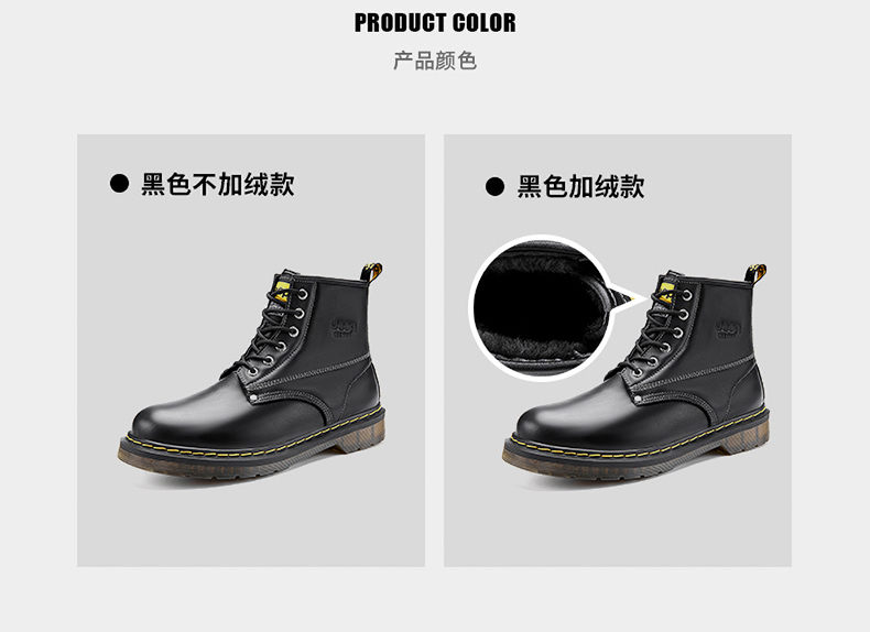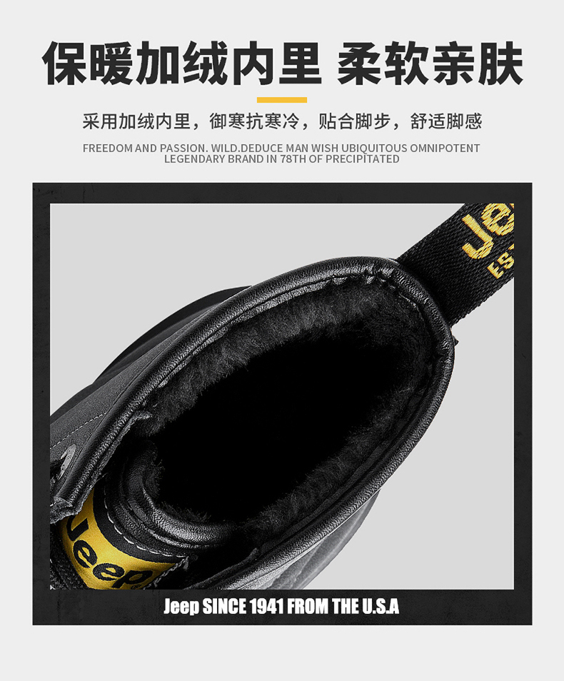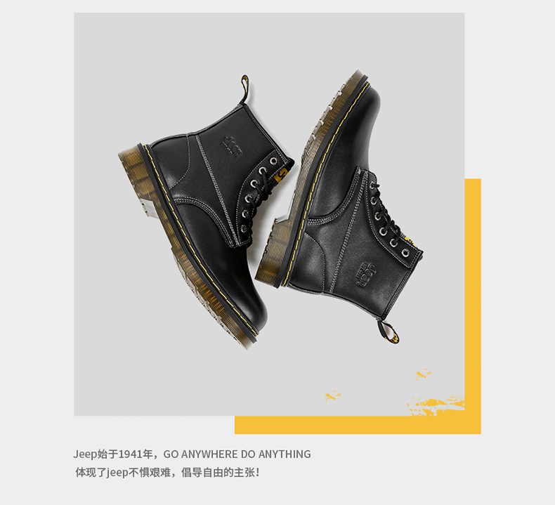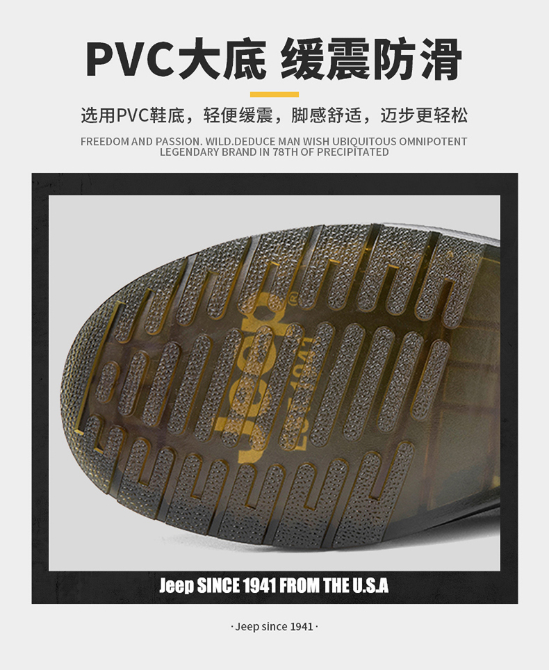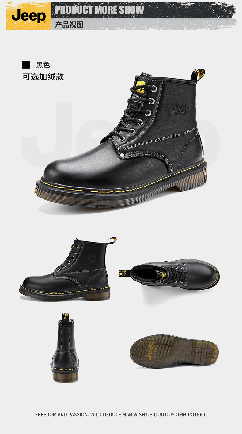 这款Jeep英伦风高帮真皮男靴,款式上是6孔工装马丁靴,非常帅气逼人,鞋面是头层牛皮制成,摸着手感舒适,光泽感强。加厚PVC防滑外底,抓地力强,支撑性好,还能增高。