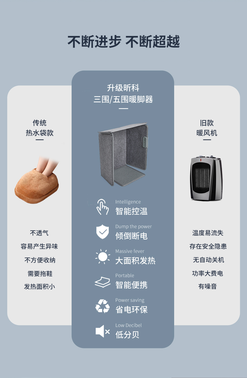 曾获中国2019红星设计大奖,红外热辐电热膜三面环绕发热、三档调温、45°倾倒保护,可折叠收纳不占地,相比以往推荐的萌笨的大拖鞋式暖脚宝,多了一点诗情画意,取暖空间更大,整个腿部都能感受到温暖。