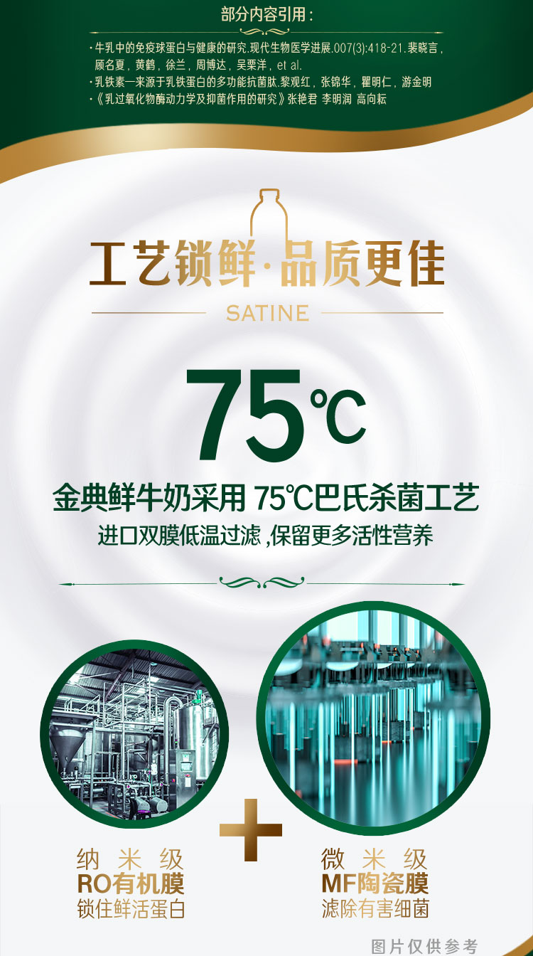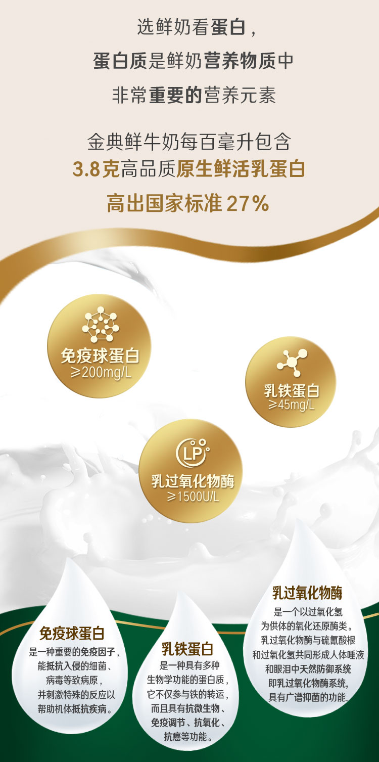 奶源来自GAP一级认证牧场,每100ml含3.8g鲜活乳蛋白,125mg原生高钙。蛋白质是鲜奶营养物质中非常重要的营养元素,高出国家标准27%,另外活性营养含量也很高,其中免疫球蛋白≥200mg/L、乳铁蛋白≥45mg/L、乳过氧化酶≥1500U/L。