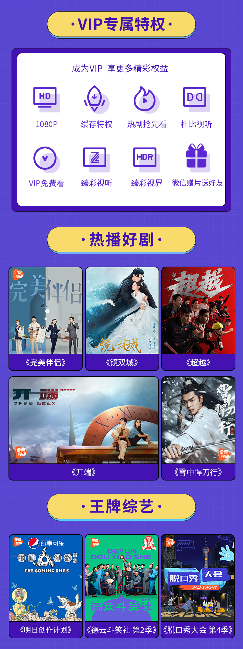 腾讯视频VIP:电脑、iPad、手机(官方标价:20元/月、198元/年)超级影视VIP:电脑、iPad、手机、电视(官方标价:30元/月、330元/年)