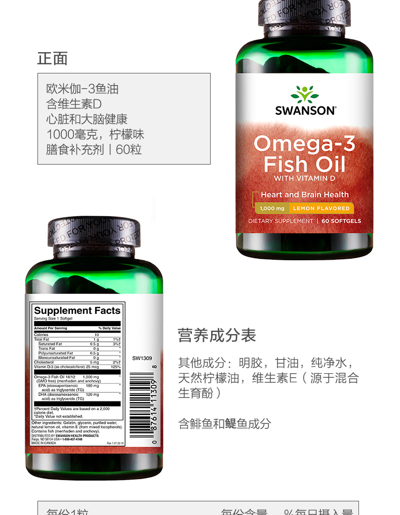 美国原装进口,FDA认证,全新一代采用斯旺森专利分子蒸馏鱼油技术,能够在生产过程中把有害的化学物质去掉,食用更健康,更好的达到保健目的。特别添加了维生素D,能促进钙、铁、镁、磷和锌在肠道中的吸收,进而调节多种生理功能,提高免疫力,使骨骼强健。