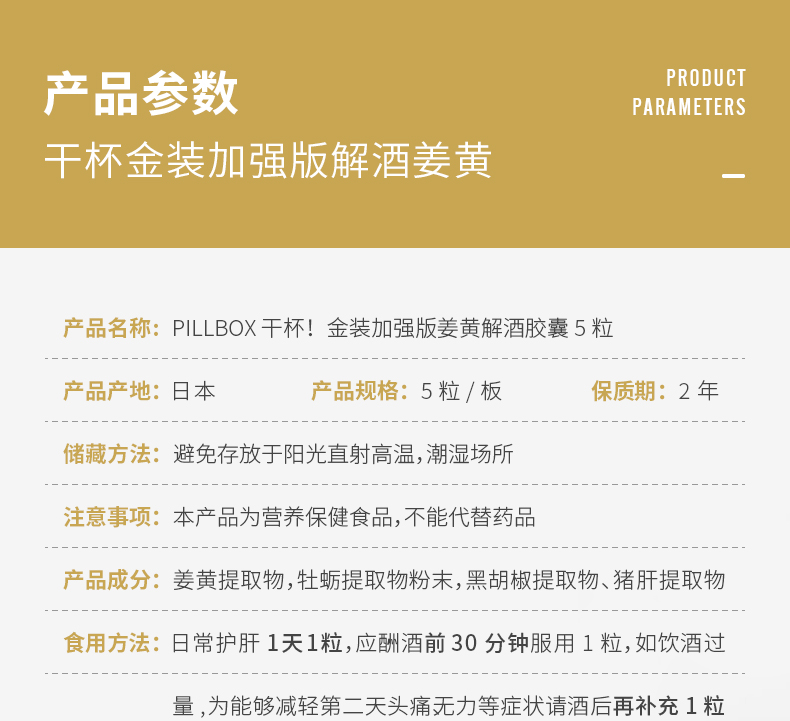 这款Pillbox 干杯EX姜黄解酒胶囊,日本进口,含有姜黄、黑胡椒、猪肝及牡蛎提取物,能生成肠胃保护粘膜,帮助阻断部分酒精吸收,活化醒酒酶,促进血液循环,加速排尿、排汗,以祛除体内的酒精代谢物,从而降低酒精对身体的伤害。能迅速增加人体能量,有效舒缓头晕虚脱、恶心呕泻、四肢无力等症状。