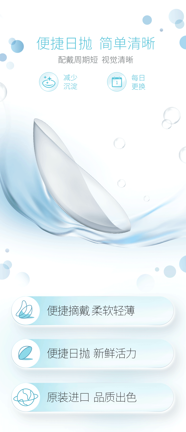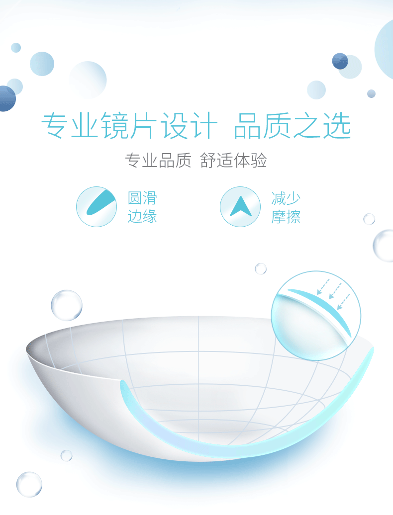低镜片设计,减少眨眼间与镜片的摩擦,有效降低异物感,增加瞬目的舒适度;镜片边缘采用干式膜铸工艺,使表面更加光滑,成形性好,更易于操作,对初期佩戴者尤其方便。