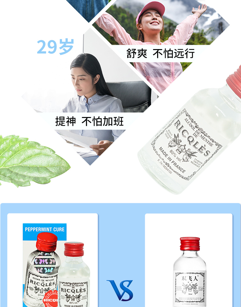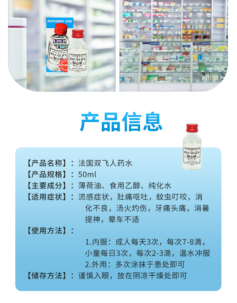这款RICQLES双飞人爽水,容量为50ml,口服食用级的原辅料配制而成,采用薄荷、乙醇和纯化水制作,天然原料,安全无毒,对缓解伤风感冒,肚痛疴呕,蚊虫止痒等有着很好的疗效,儿童也可适用,适合家中常备。保质期:60个月