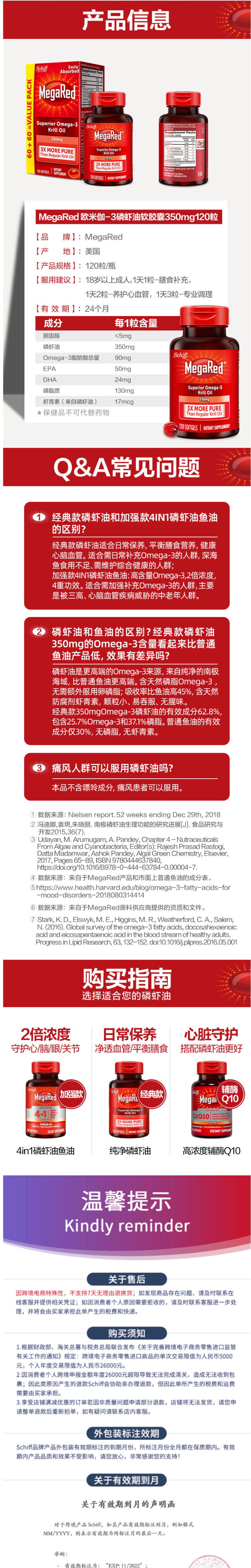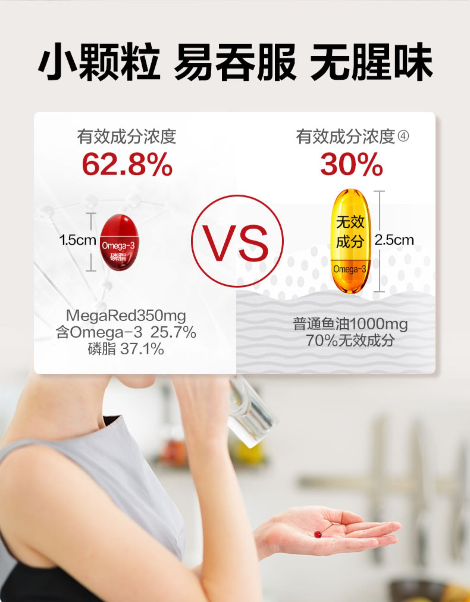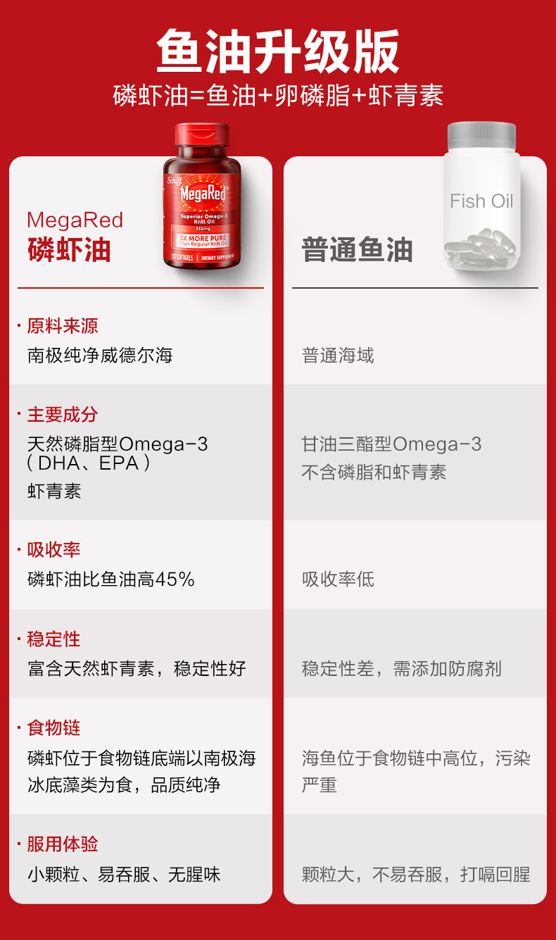 这款Schiff MegaRed 欧米伽3 深海磷虾油胶囊,美国原产,以南极纯净深海的极磷虾为原料,提取磷虾油精华,比鱼油更易吸收,效果更好。