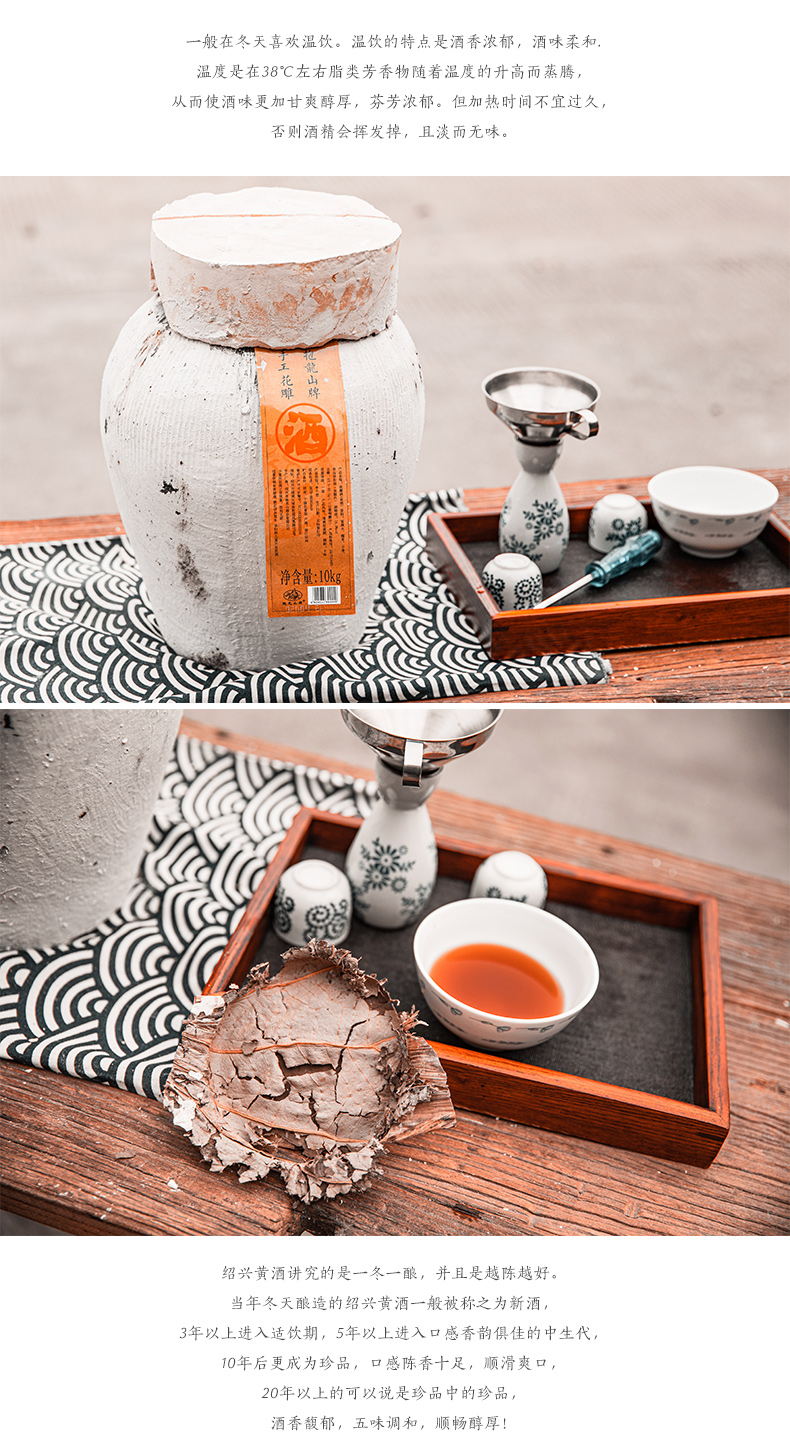 抱龙山牌 冬酿花雕,酒精度14%vol,总糖15.1-40.0g/L,酒龄十年。甄选用糯米、小麦、鉴湖水和酒曲发酵酿造,纯手工冬酿,散发着自然米香,色如可乐,粘稠饱满,入口柔和,醇厚甘甜,含有大量人体所需的氨基酸,维生素、矿物质等营养物质。江南的冬天空气潮湿寒冷人们常饮用此酒来增强抵抗力,有养身的功效。