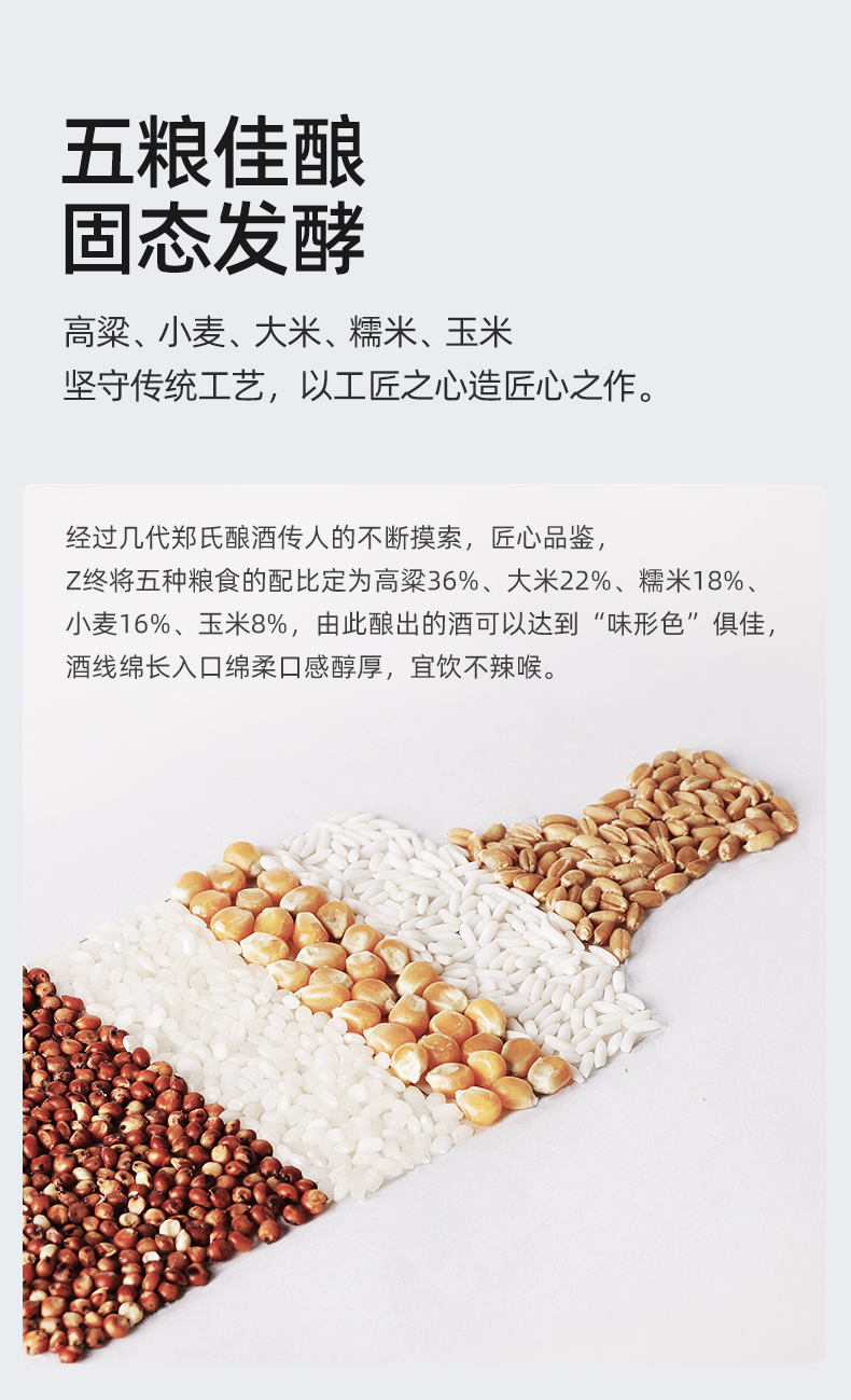 采用36%高粱、16%小麦、22%大米、18%糯米、8%玉米五种粮食科学配比,传统工艺与现代工艺相结合,以3年陈坛陈酒作为基酒,加上15%6年窖藏调味酒,品酒师-郑玉江先生亲自勾调,酒线绵长,香似幽兰,入口爽净绵甜不辣喉,高白光瓶,通透细腻,烫金标签彰显品质,送人也非常有档次。