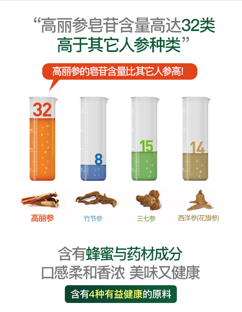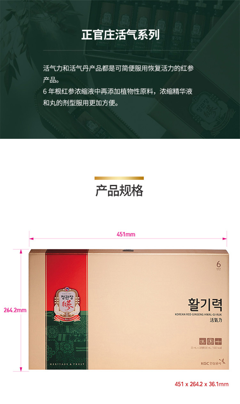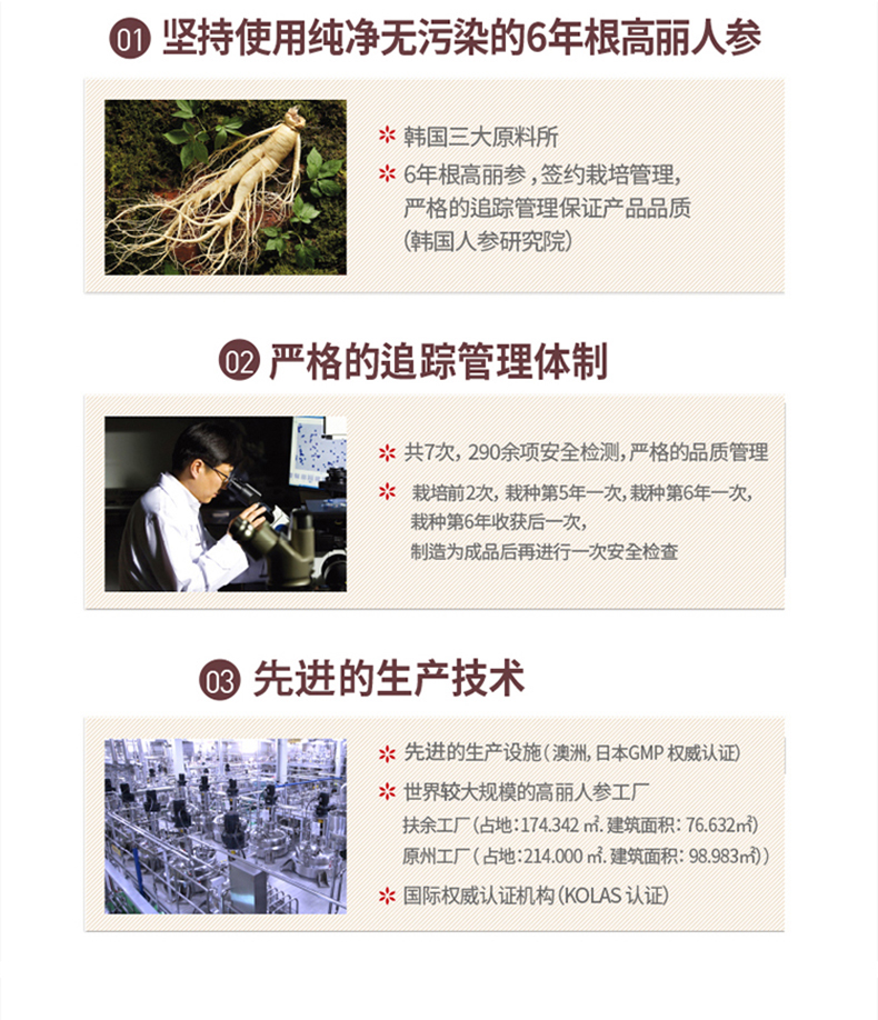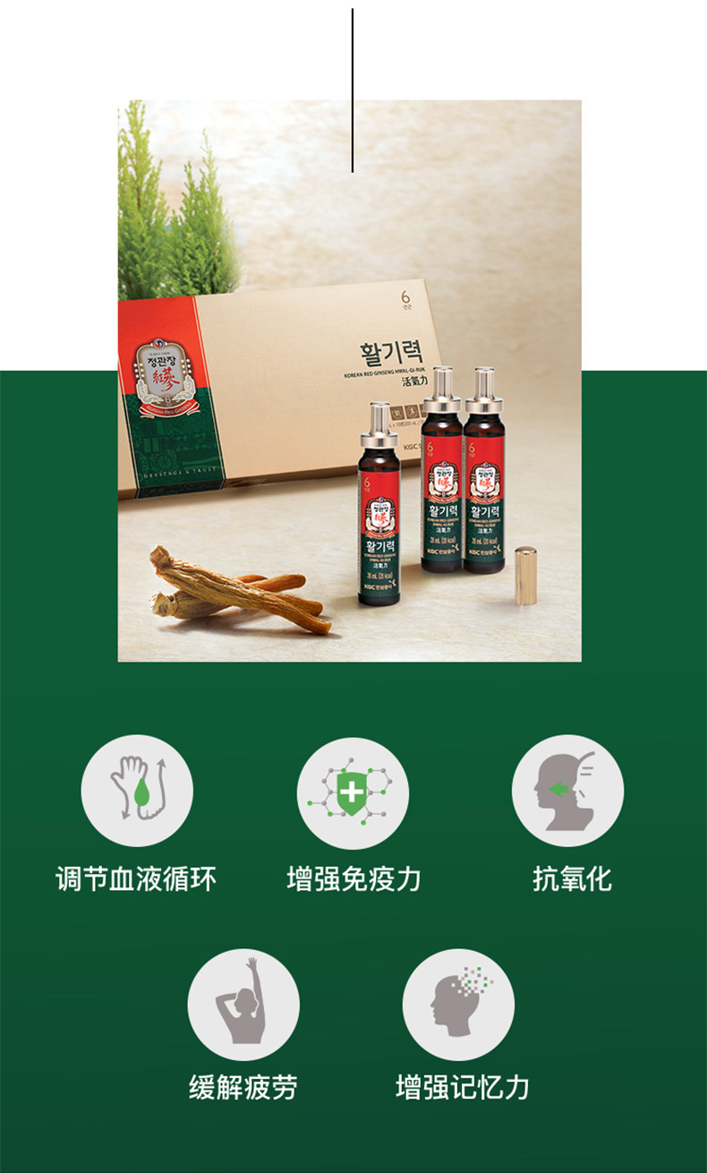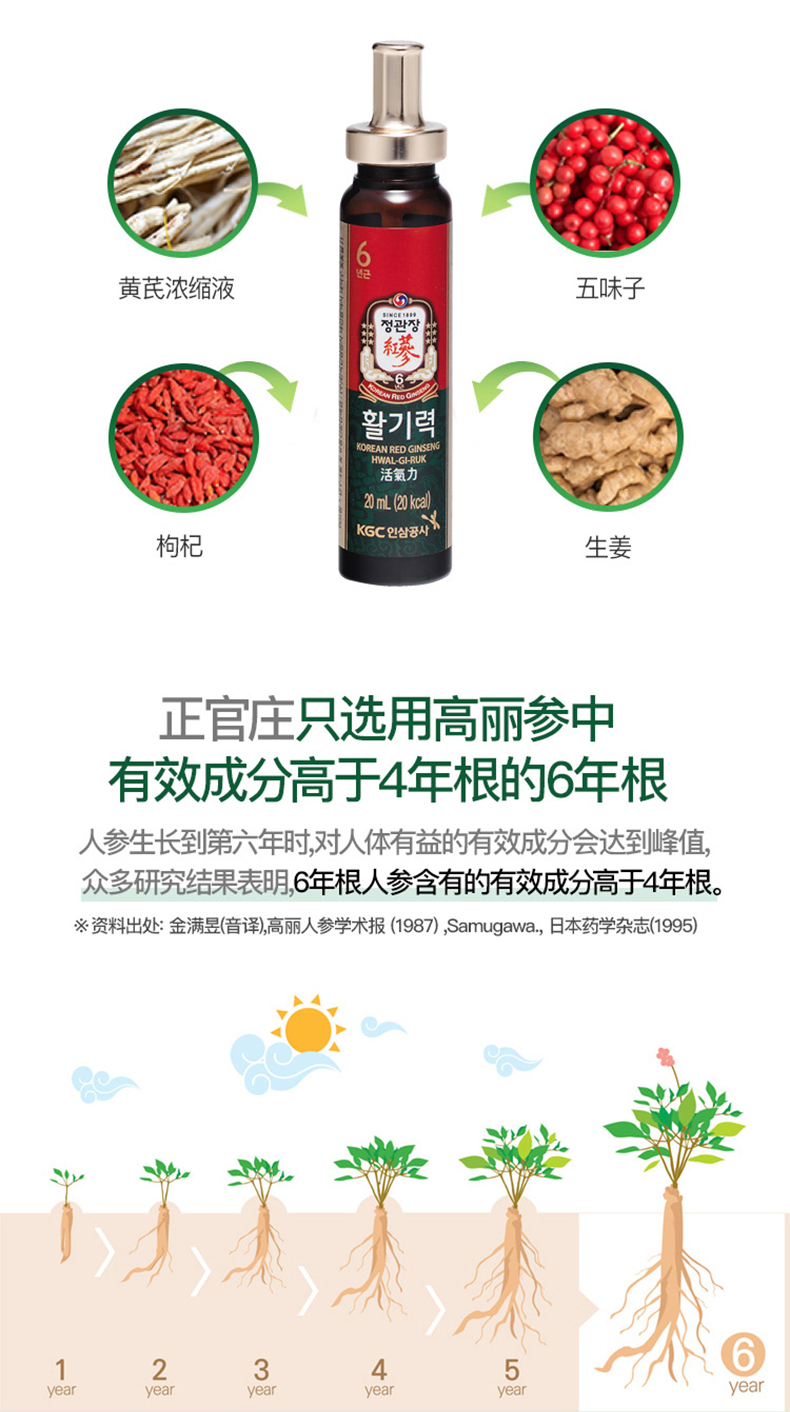 这款正官庄 6年根高丽参精浓缩液胶囊,以6年根高丽参为主要原材料(高丽参富含32种人参皂甙),