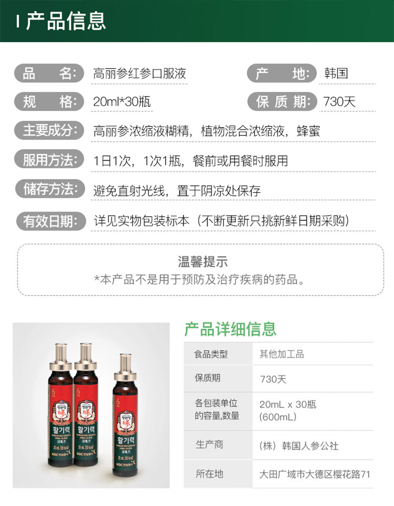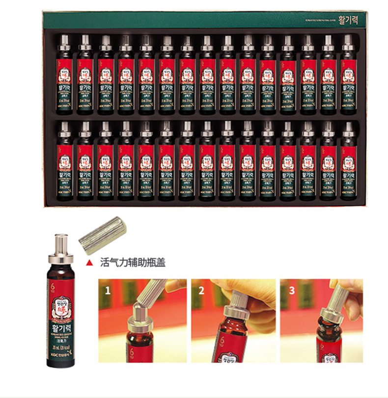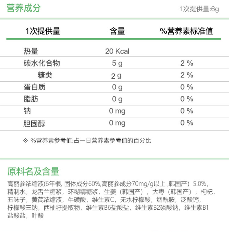 营养成分:高丽参浓缩液(6年根固体成分60%高丽参成分70mg/g以上韩国产) 5.0%,精制水,龙舌兰糖浆,环糊精悬浆,生姜(韩国产)、大枣(韩国产) 构杞。五味子,黄芪浓缩液,牛磺酸。维生素C.无水柠檬酸,烟配胶,泛酸钙,柠檬酸三情,西怕好握取物,维生素B6盐酸盐。维生素B2情酸钠。维生素B1盐酸盐,叶酸
