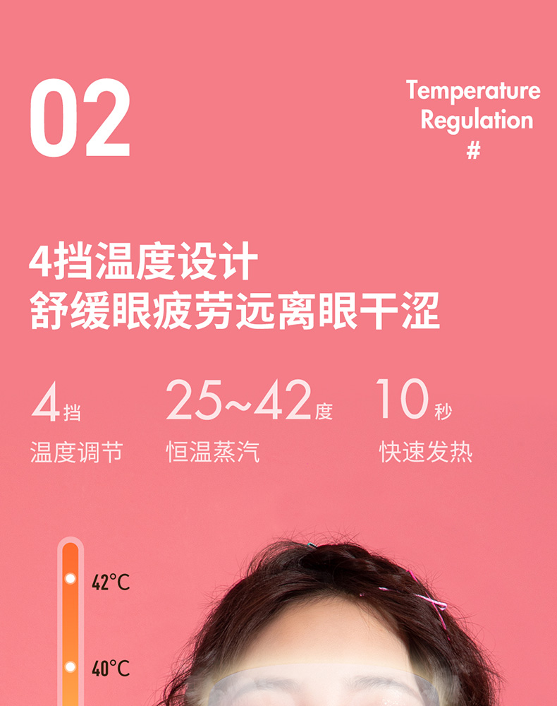 10秒速热无需等待,25-42℃共4挡温度可调,常温清凉舒爽,醒目提神解乏;高温档如同热毛巾热敷般舒适,缓解酸涩肿胀。