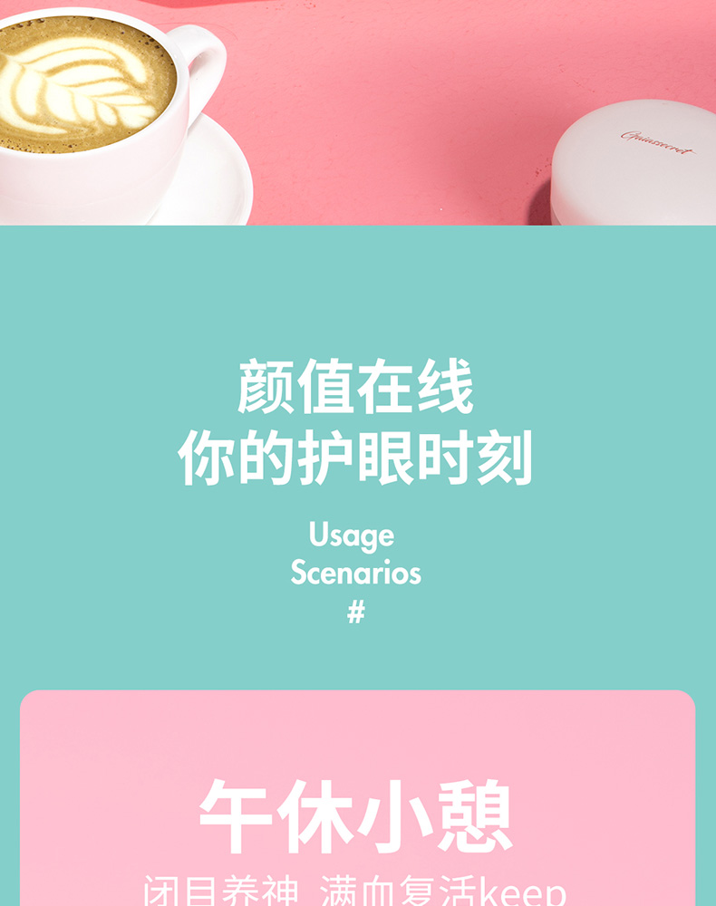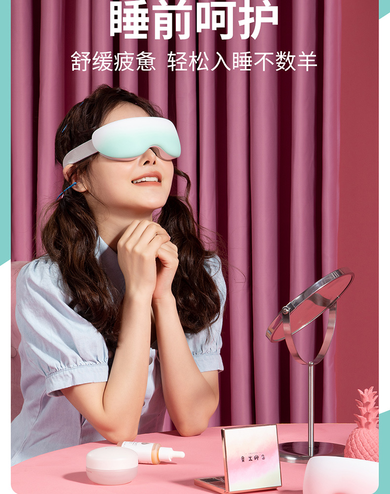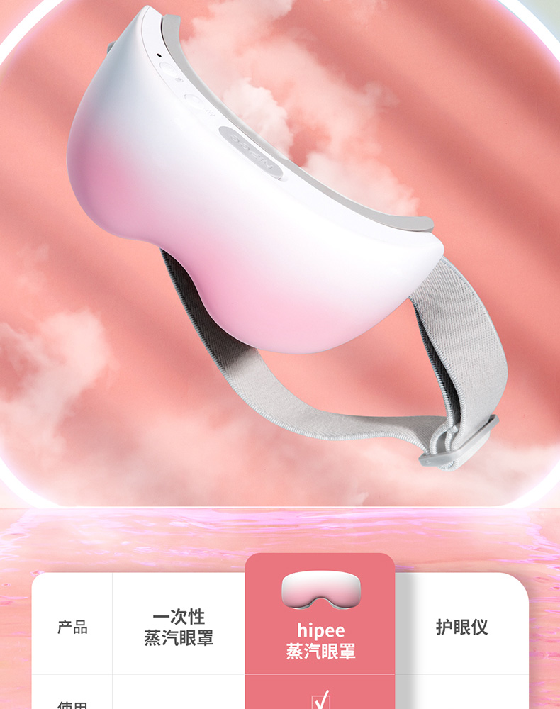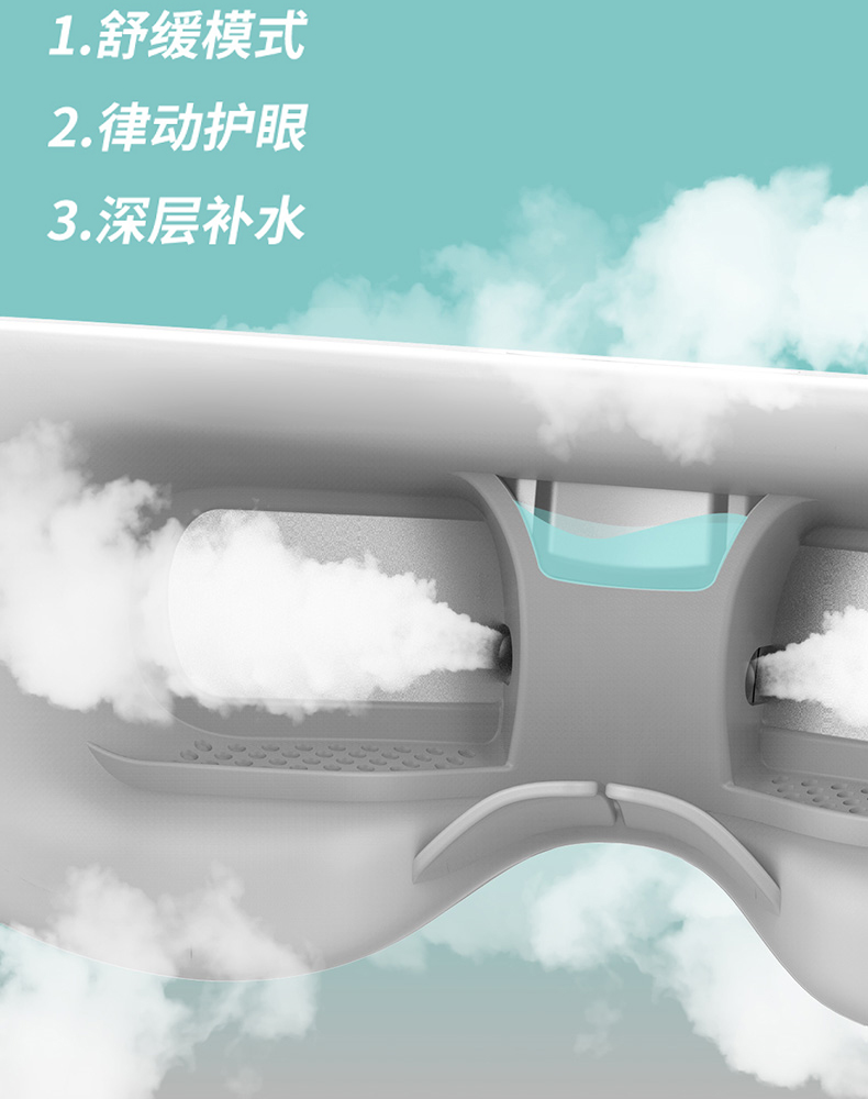 细节上:眼罩185g超轻量化设计,采用食品级硅胶材质,3D凹槽设计,舒适贴合眼部轮廓,柔软亲肤,适用各种脸型,可视化透明水槽,可准确观察剩余水量,操作语音提示,使用简单方便,智能定时10分钟刚刚好,还可蓝牙连接音乐,按摩更放松。