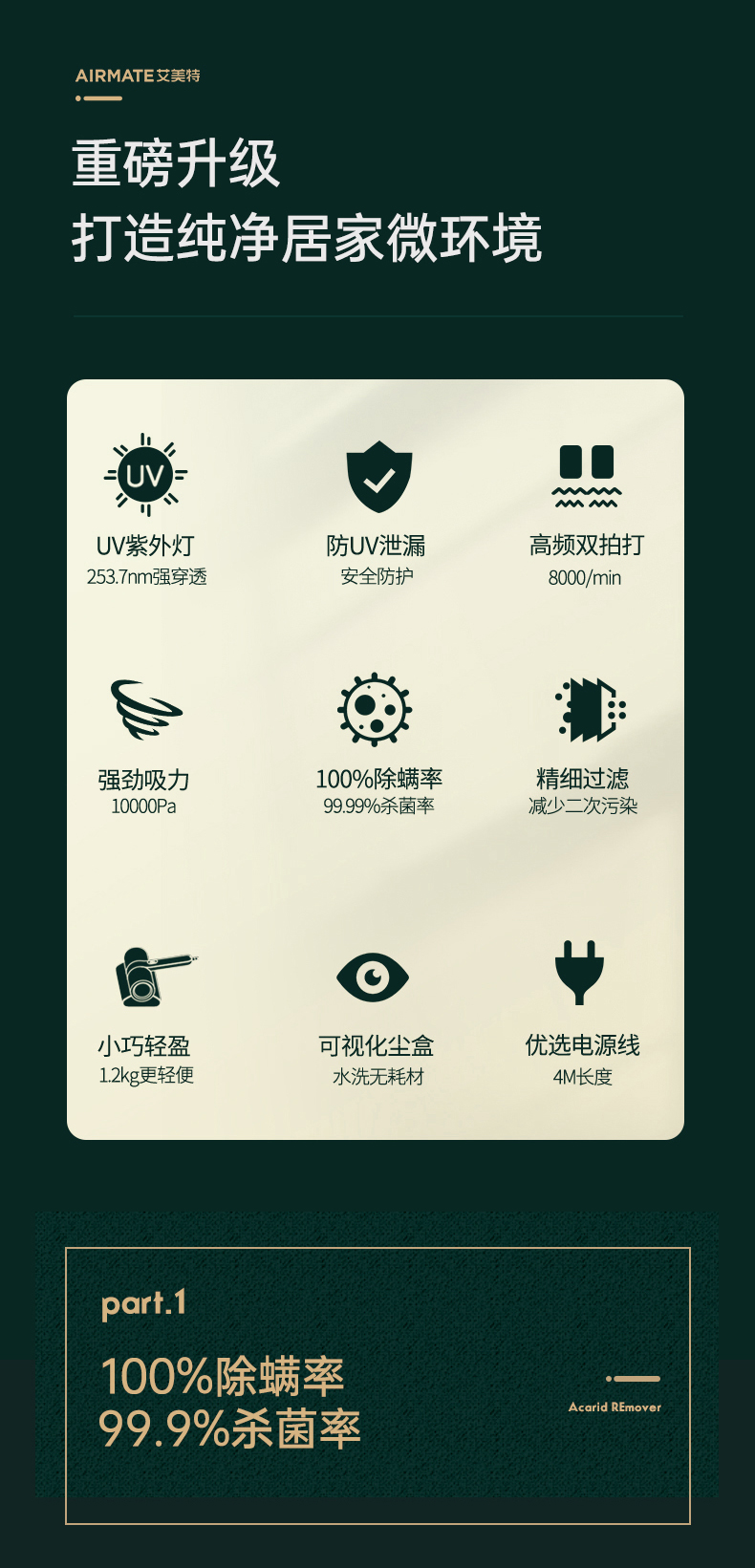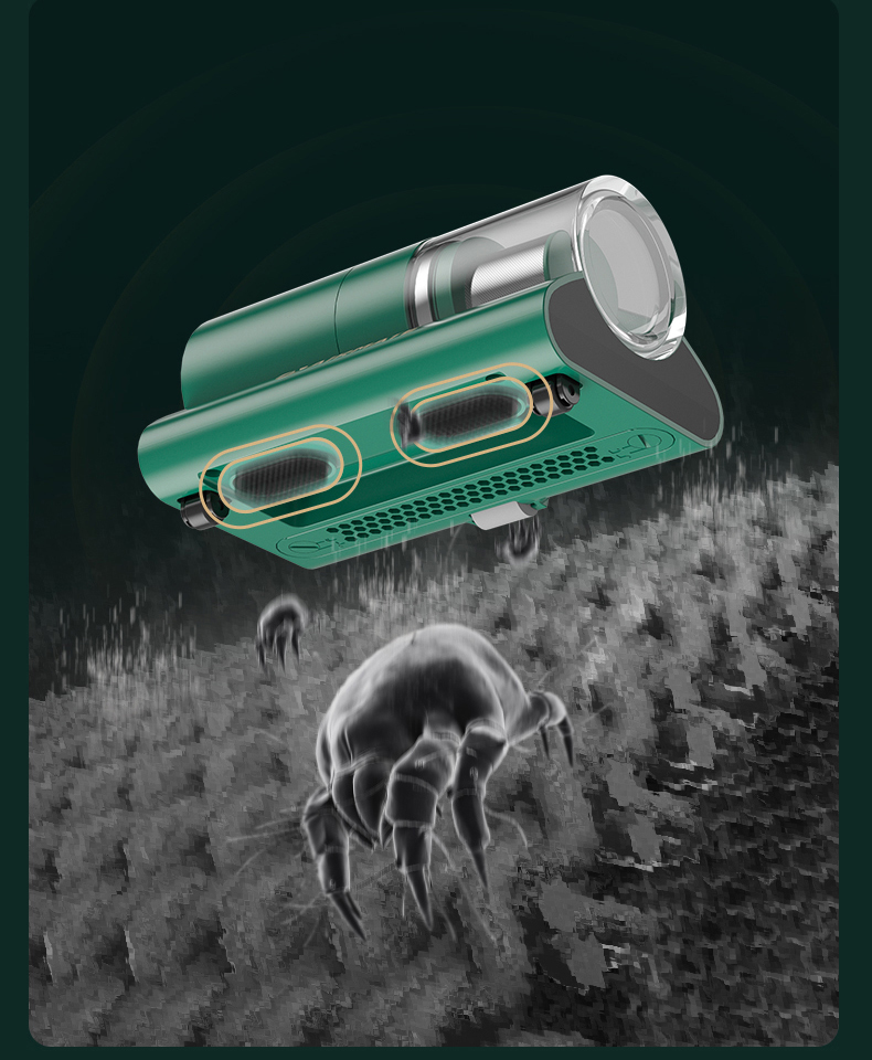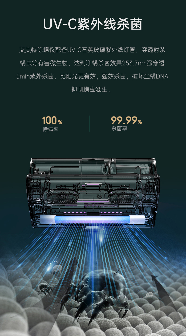 这款艾美特 LVH1002-U01手持式除螨仪,会在织物表面进行约8000次/min的双振动板高频拍打形成强震,震出深藏在床褥中的螨虫,然后回旋气流配合约10000Pa的飓风式吸力,轻松吸走尘螨,最终可达到除螨率100%、除菌率99.99%的效果。