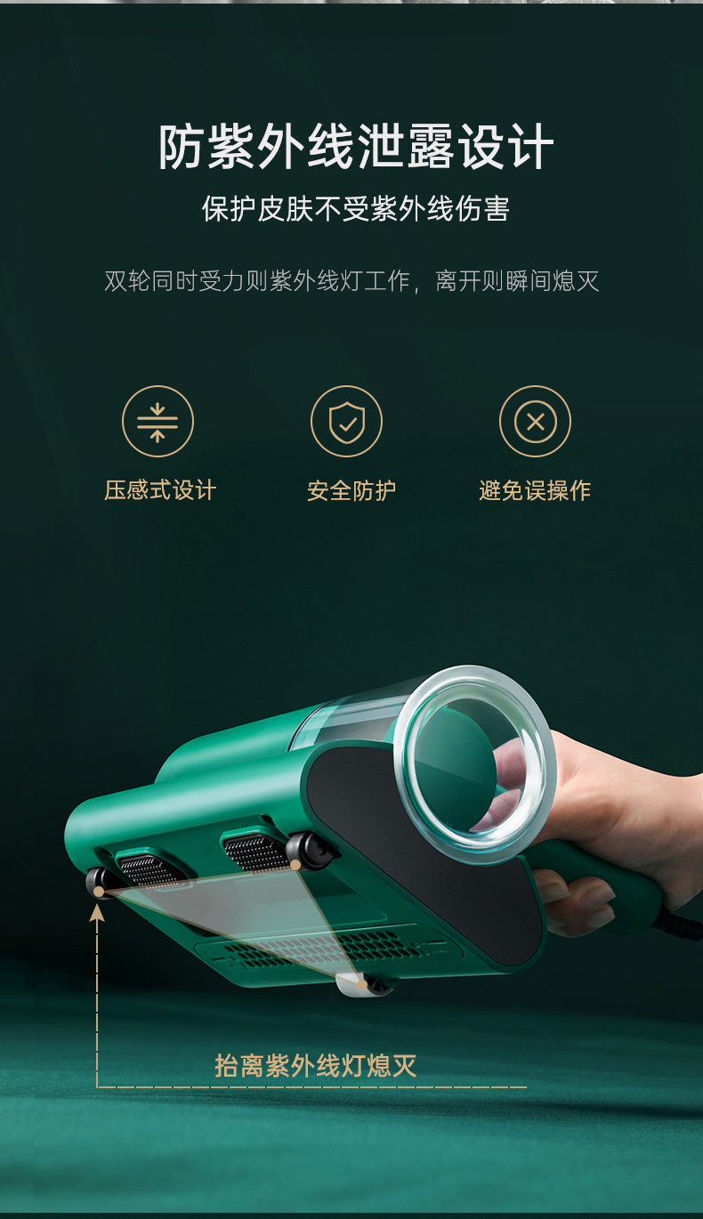 配UV-C紫外线消毒杀菌功能,杀菌率超99.99%,在使用上,在贴面平直使用时,紫外线杀菌会正常工作,当提起机身超过5cm,紫外线自动关闭;提起机身超过30°,紫外线也会自动关闭,保证使用者的安全。