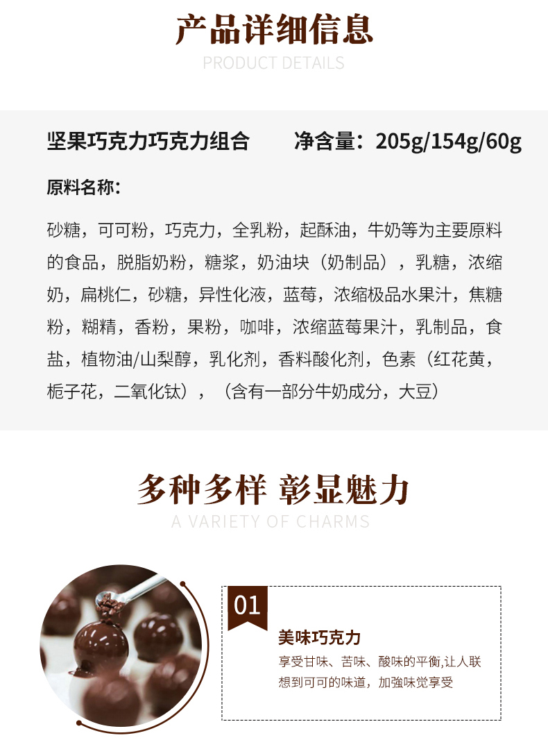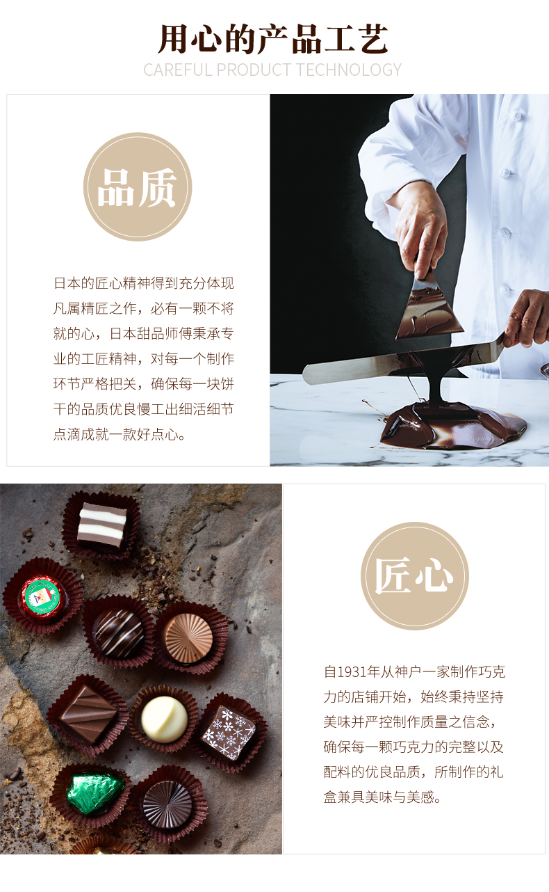 使用优良的砂糖、可可粉、巧克力、全乳粉、起酥油、牛奶等为主要原料,纯手工制作而成,口感醇厚柔然。