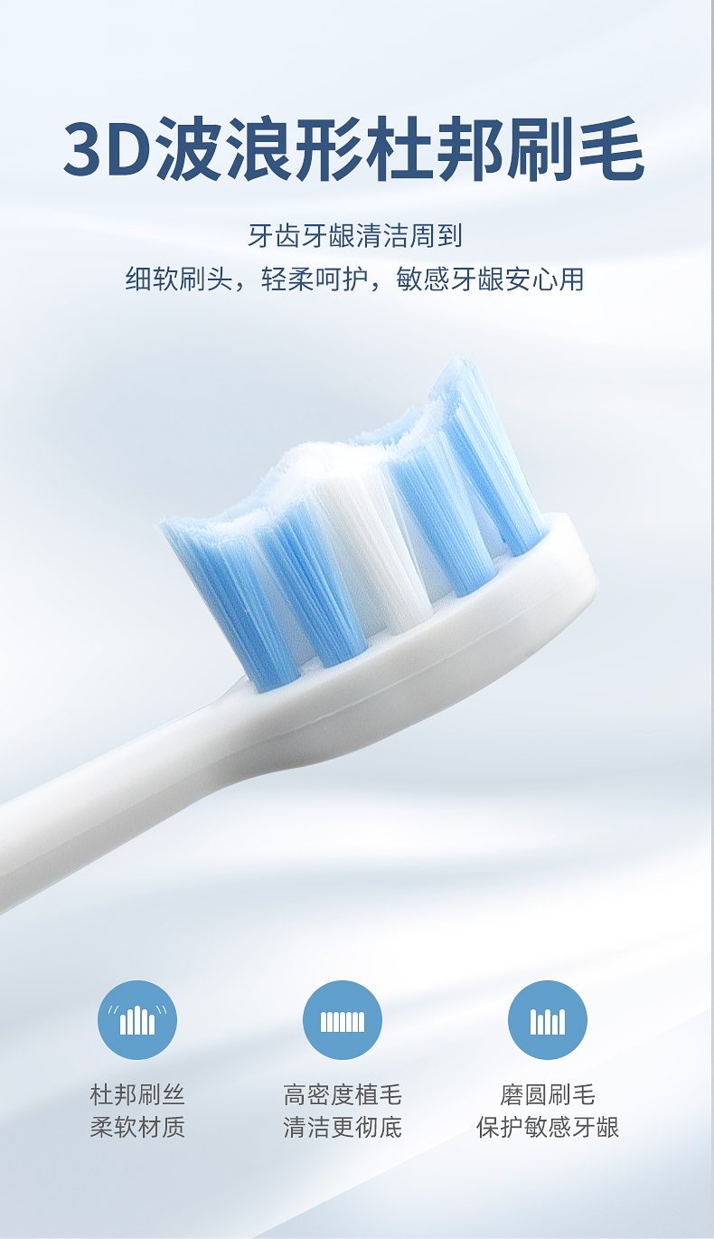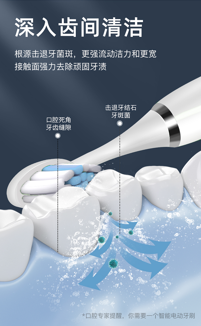 精选柔软杜邦刷毛,精细磨圆刷毛工艺,有效清洁淡化牙渍,健康祛除牙菌斑,呵护不伤牙龈。整体多层材质覆盖,有效降低震动噪音,IPX8级防水,不惧浴室潮湿环境,内置大容量锂电池,续航持久。