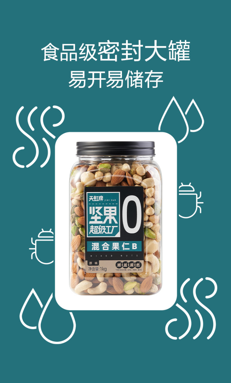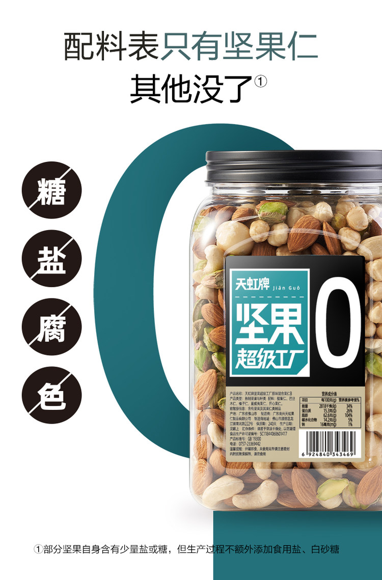 天虹,1958年始创于香港,是一个超60年历史的坚果品牌;这款天虹牌 混合果仁500gg盒装,内含:美国巴旦木仁、印尼腰果仁、土耳其榛子仁、澳大利亚夏威夷果仁、美国加州开心果仁等多种果仁混合,烘烤过程无添加盐和糖,最大程度保留纯粹原香,不易上火,好吃又营养。