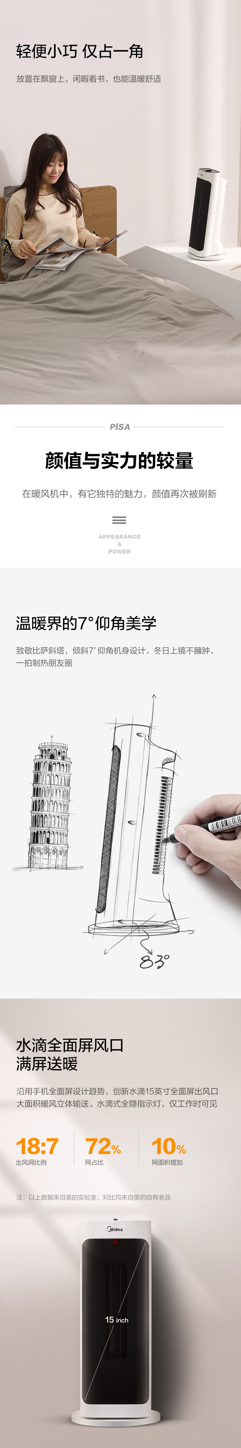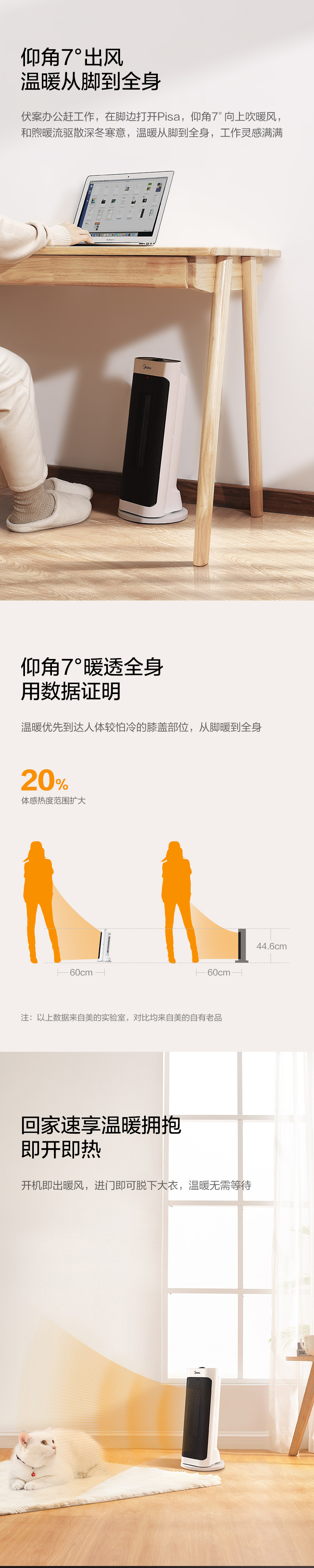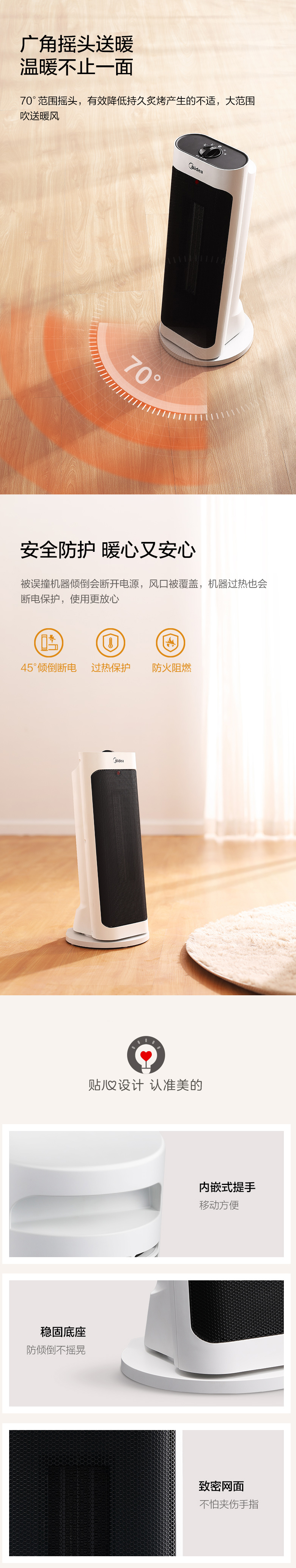 美的速热暖风机取暖器,坐式设计,7°仰角出风,外观简洁有质感,创新免打孔悬挂式,2000W大功率,3秒速热。整机采用国标V0级防火材质,有效阻燃。