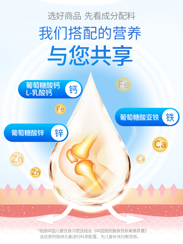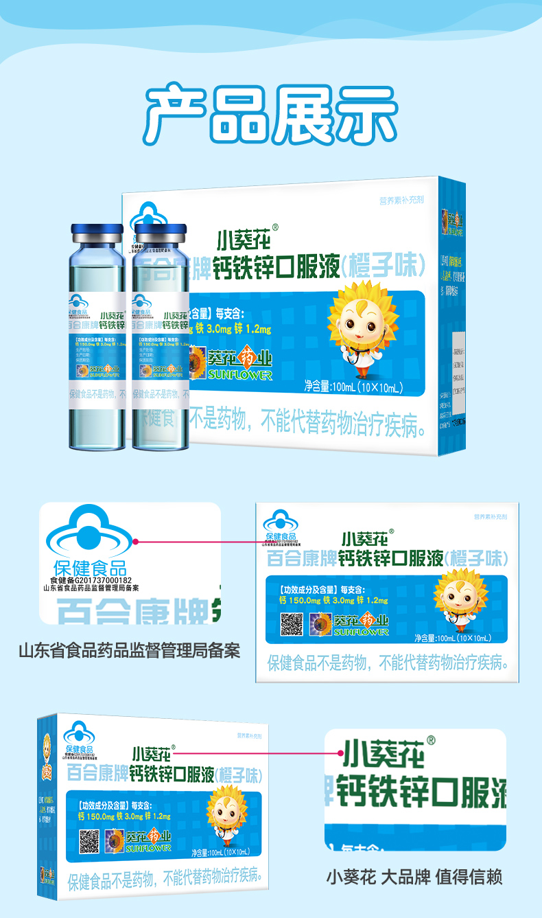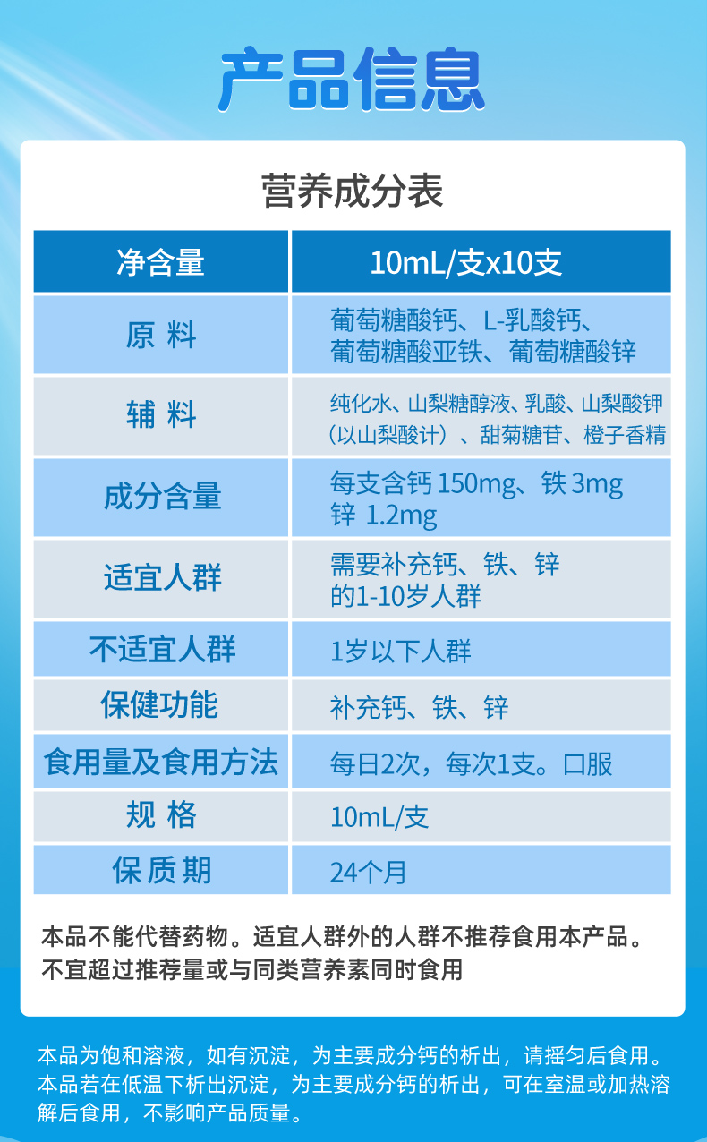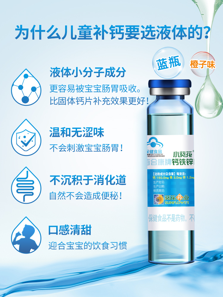 每支含钙150mg、铁3mg、锌1.2mg液体钙易吸收。液体钙溶解度好,钙离子更易被吸收。