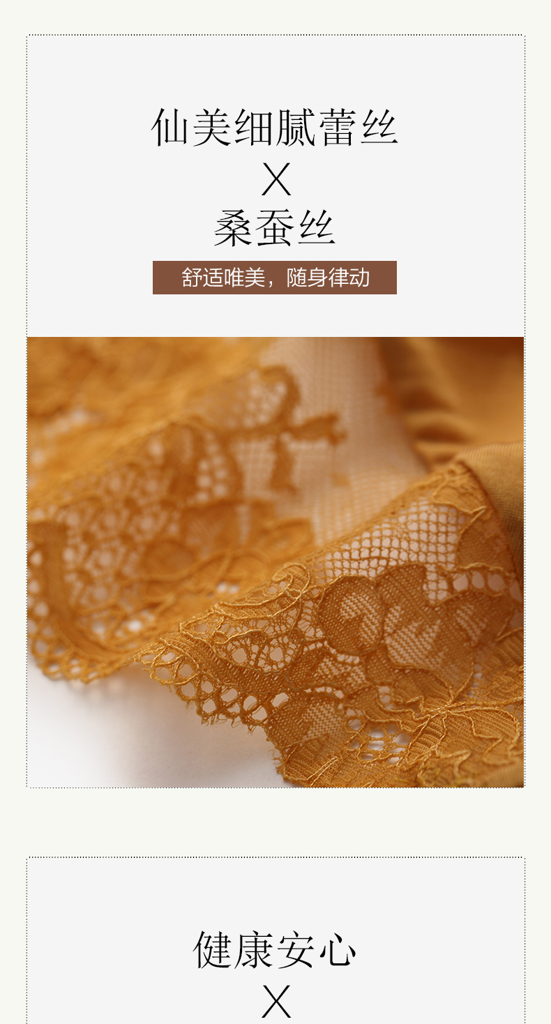 这款金三塔 女士100%桑蚕丝蕾丝无痕真丝内裤,采用100%桑蚕丝面料,与人体有极好的生物相容性,透气吸湿,亲肤顺滑,双面超舒感,裆部双层真丝,大面积蕾丝装饰,3D剪裁,舒适不勒不夹档,更显无痕质感。