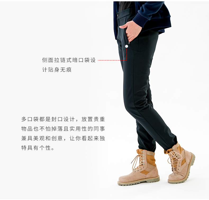 在款式和细节上,单从款式上看不出来是户外徒步裤,除了日常休闲,商务通勤也能穿。膝盖部分是3D立体剪裁,是按人体工程曲线裁剪打版制成,给膝盖在弯曲活动时留下了充足的空间,上身非常合体舒适。腰头两侧有橡筋带裤袢,无论是单穿或用腰带都行。