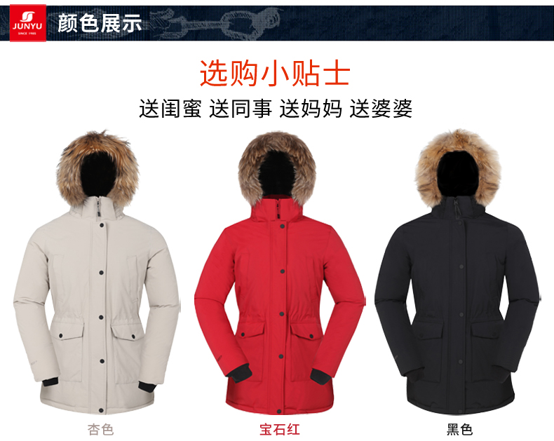 这款君羽寒峰女中长款女士羽绒服,属于酷寒款,可抗-15℃~-30℃,内里填充了800蓬90%鹅绒,M码充绒量210克,属于加厚厚度,防风防雪耐磨压胶防绒面料。直筒收腰设计,长度正好过臀。