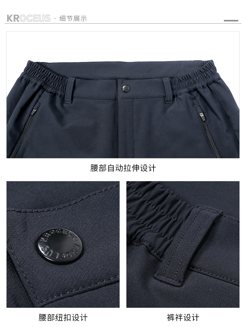 在款式和细节上,单从款式上看不出来是户外徒步裤,除了日常休闲,商务通勤也能穿。膝盖部分是3D立体剪裁,是按人体工程曲线裁剪打版制成,给膝盖在弯曲活动时留下了充足的空间,上身非常合体舒适。腰头两侧有橡筋带裤袢,无论是单穿或用腰带都行。