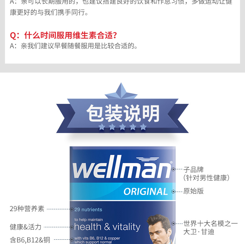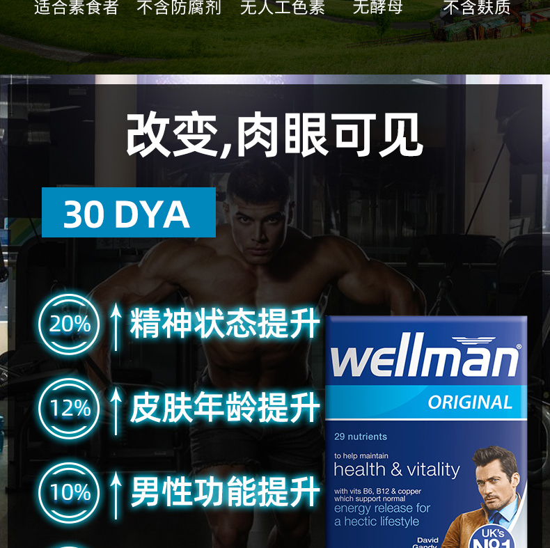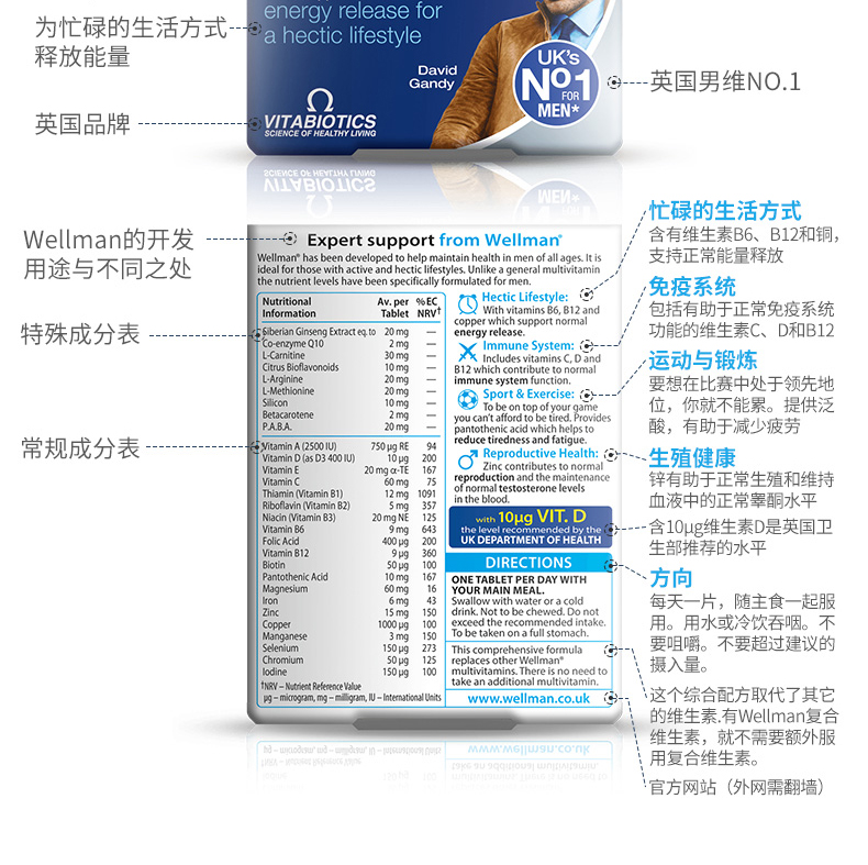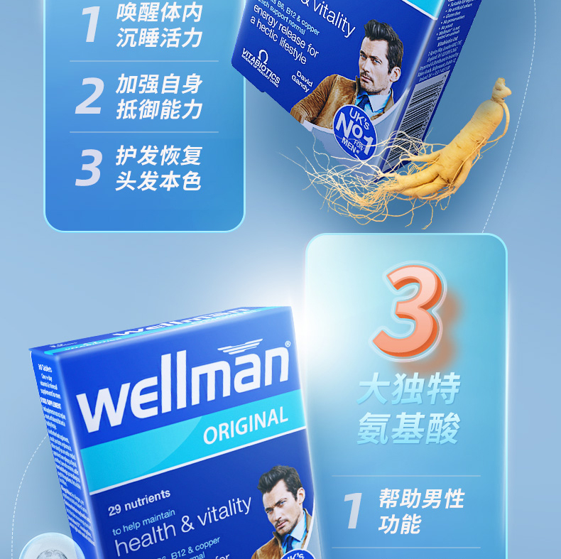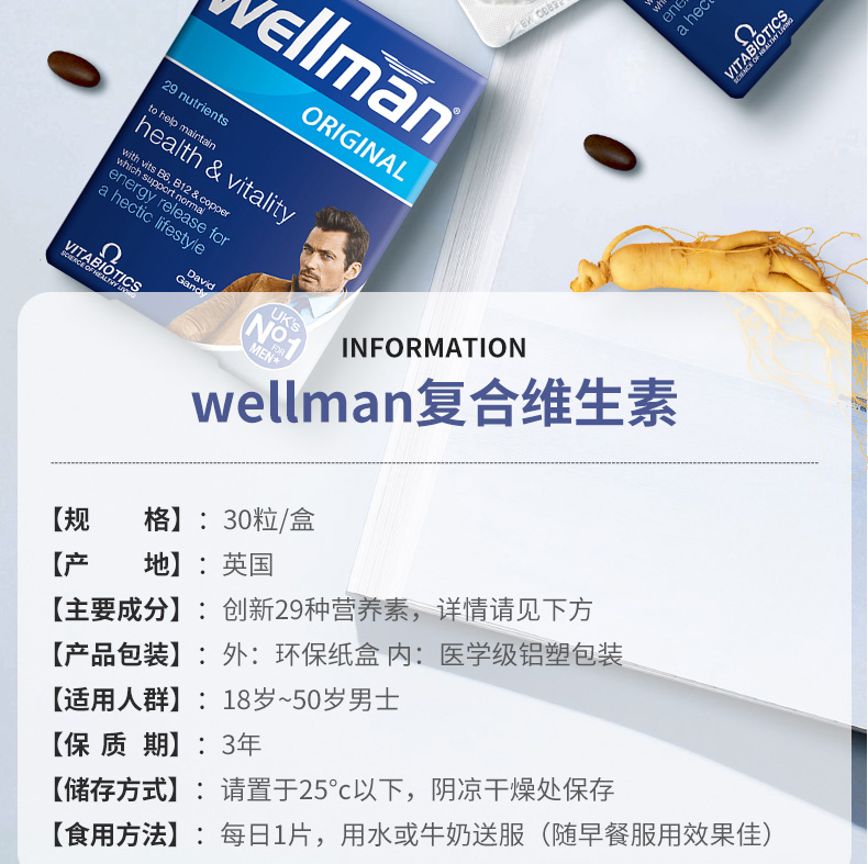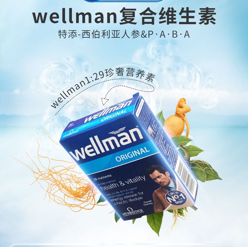 这款维百莱Vitabiotics 男性综合维生素片,英国原产,专为男士设计,从天然物质中提取元素成分,0添加,主要成分是西伯利亚人参和28种氨基酸及维矿营养,包括富含维生素A、B、C、D、T镁、铁、锌、辅酶Q10等多种维生素。