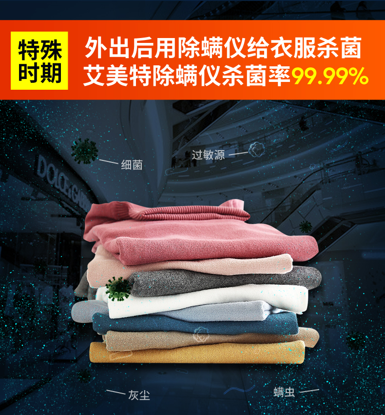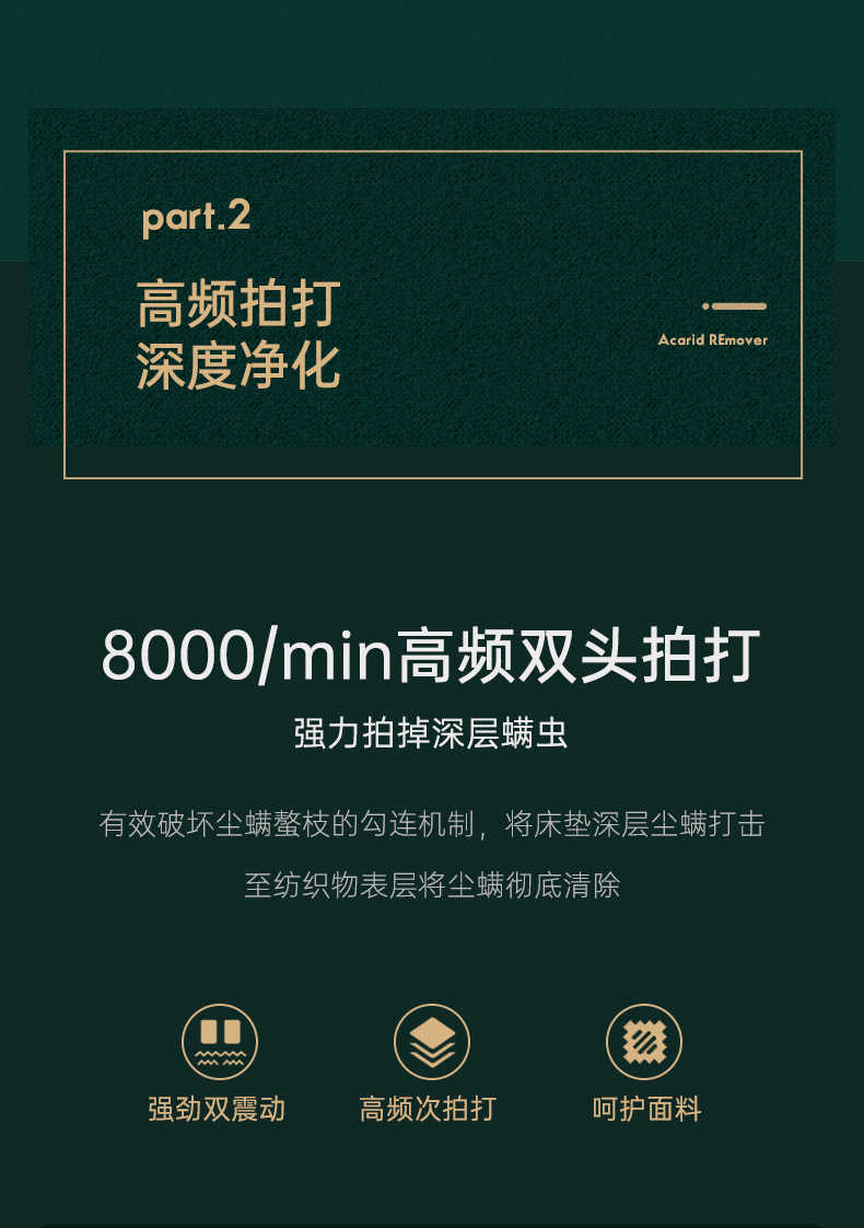 这款艾美特 LVH1002-U01手持式除螨仪,会在织物表面进行约8000次/min的双振动板高频拍打形成强震,震出深藏在床褥中的螨虫,然后回旋气流配合约10000Pa的飓风式吸力,轻松吸走尘螨,最终可达到除螨率100%、除菌率99.99%的效果。