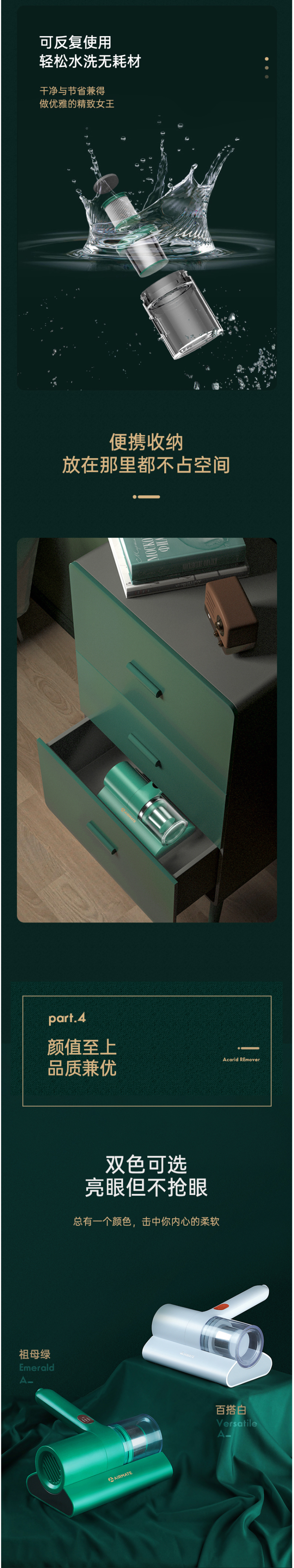 宽吸口的无刷吸头设计,不仅能减少毛发缠绕,还能大大提高吸收的效率;0.2L可视化透明尘杯,除螨效果清晰可见,耐磨可水洗;整重1.2kg的轻量化机身,女性使用时轻松省力。