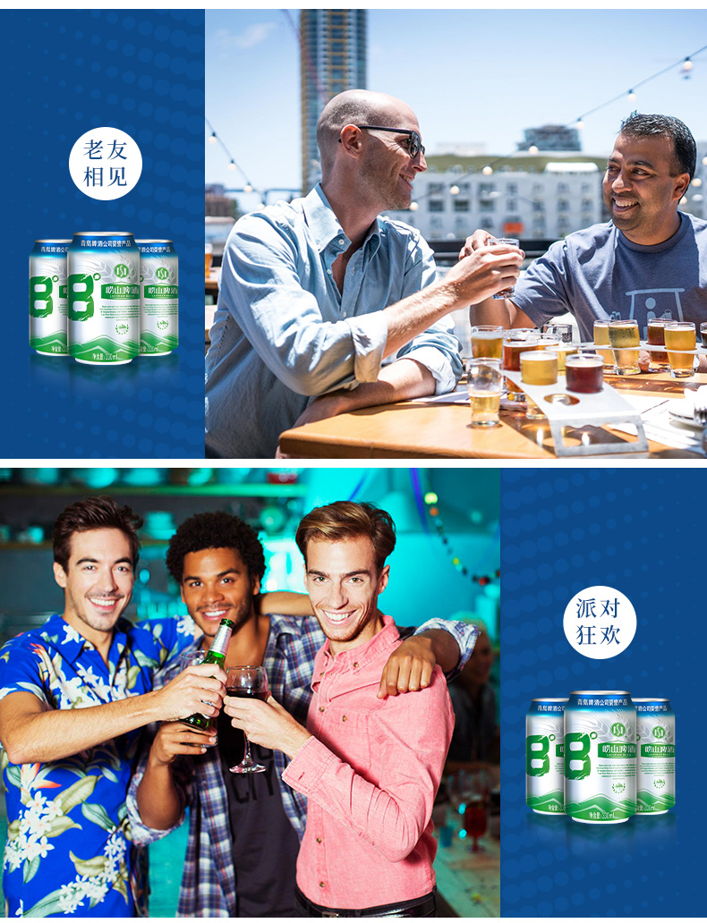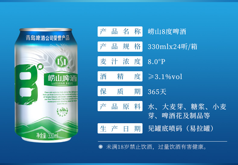 这款崂山8度啤酒,采用著名崂山泉水和大麦(澳洲麦、加拿大麦、法国大麦)、啤酒花、大米、酵母为原料酿制而成,麦汁浓度8°P。