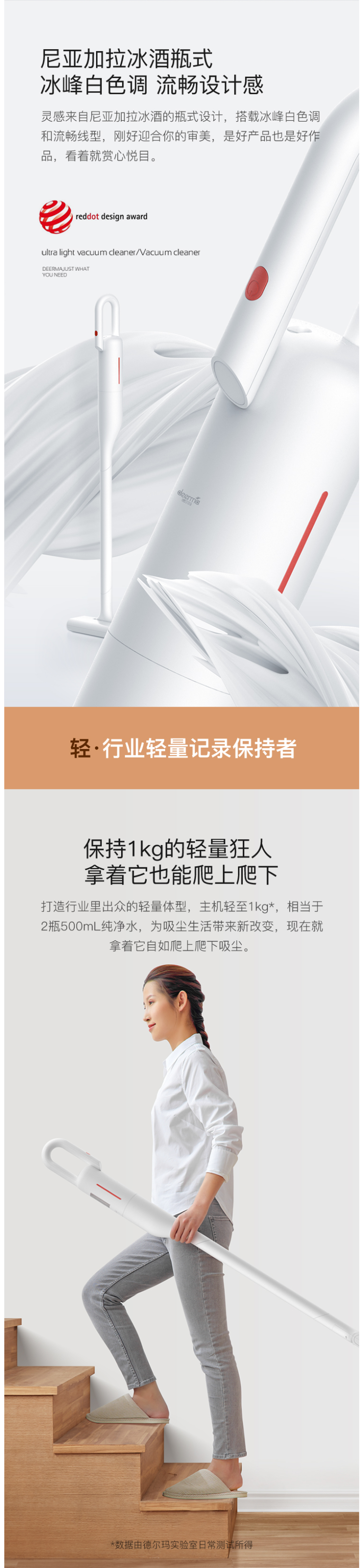 德尔玛 超轻无线吸尘器,荣获了2020红点设计大奖,简约时尚集功能美学于一体,主机仅1kg的超轻量化设计,女性朋友,和老年人群均可单手轻松操作。