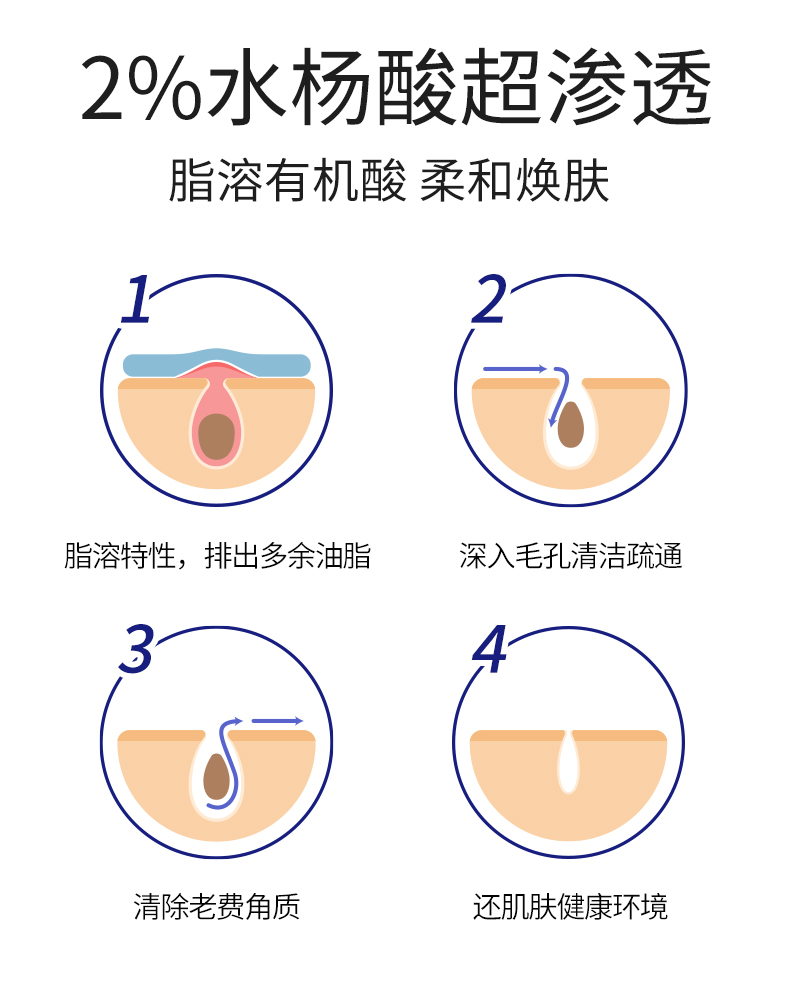 水杨酸,软化老、废、硬、角质,水杨酸成分渗透肌肤屏障,溶解角栓油脂,帮助老费角质脱落;