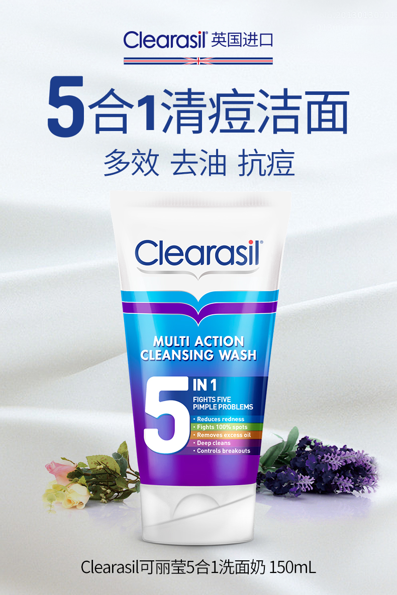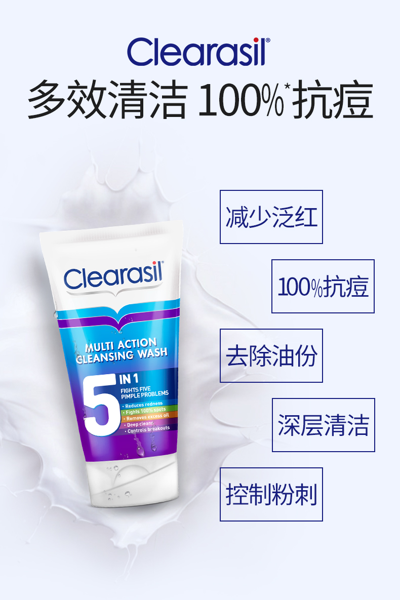 Clearasil 5效合一祛痘保湿洁面乳,美国产,主要成分是水杨酸、聚伞岩蔷薇提取物、法国薰衣草提取物、意大利蜡菊属植物提取物和柠檬精油,可以平衡脸部的水份和油脂,减轻皮肤红肿的情况、抵抗皮肤炎症和祛除痘痘,适合皮肤外油内干、刺痛红肿、多黑头闭口、毛孔堵塞、反复长痘的人群使用,
