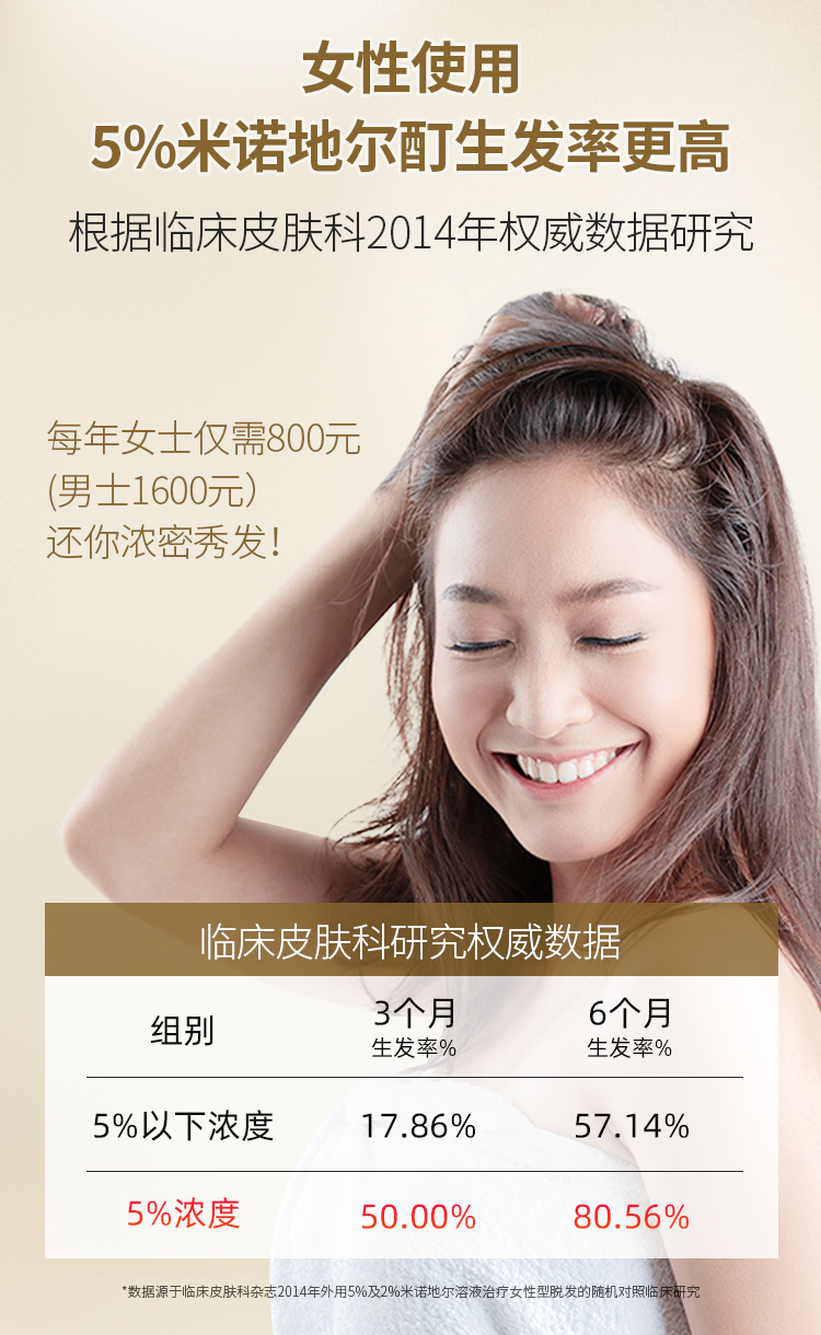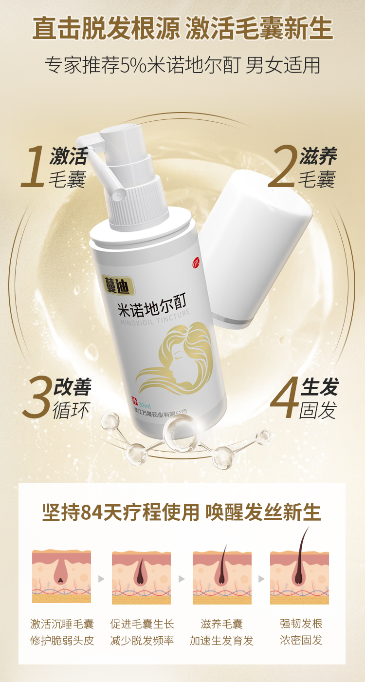 这款是国药准字OTC非处方药,是市面上真实有效的生发药用品,成份为米诺地尔,是一种周围血管舒张药,局部长期使用时,可刺激男性型脱发和斑秃患者的毛发生长。适用于男性雄激素源性脱发、女性雄激素源性脱发、斑秃患者。