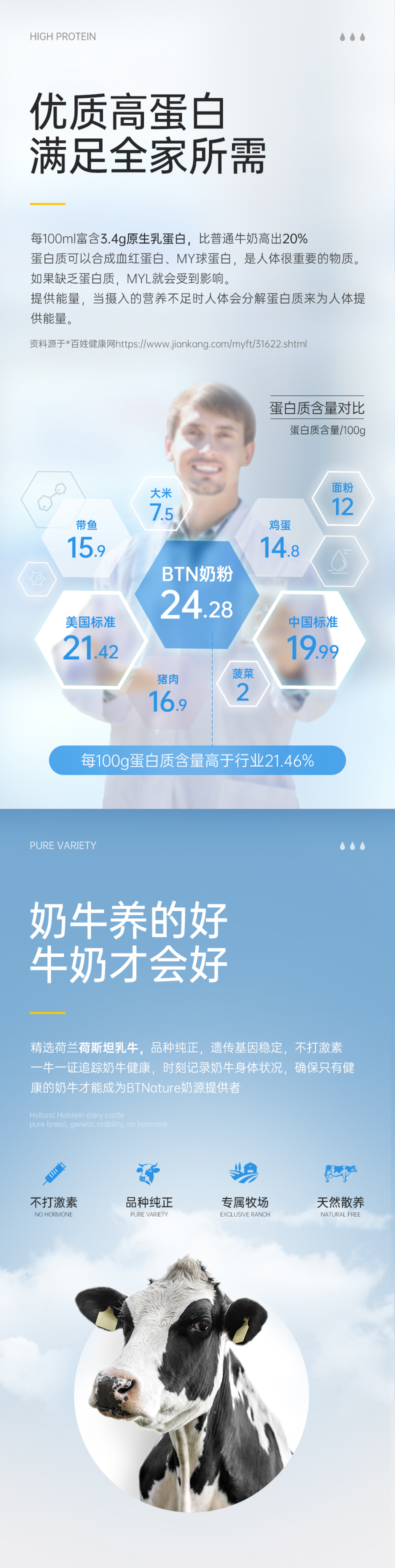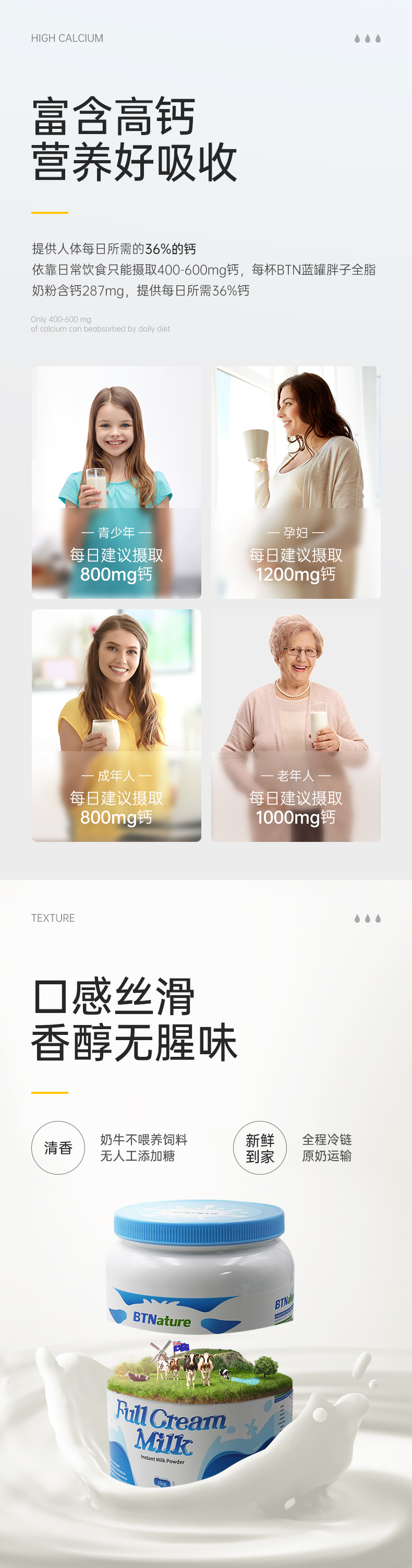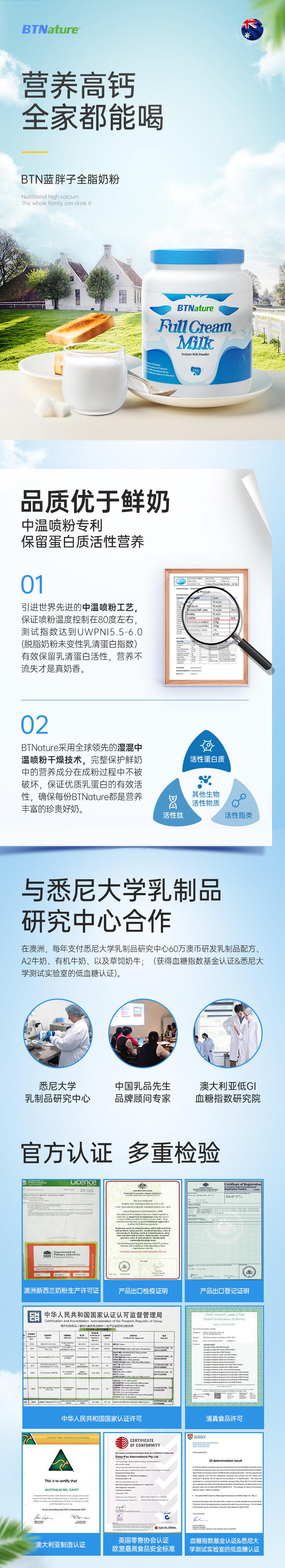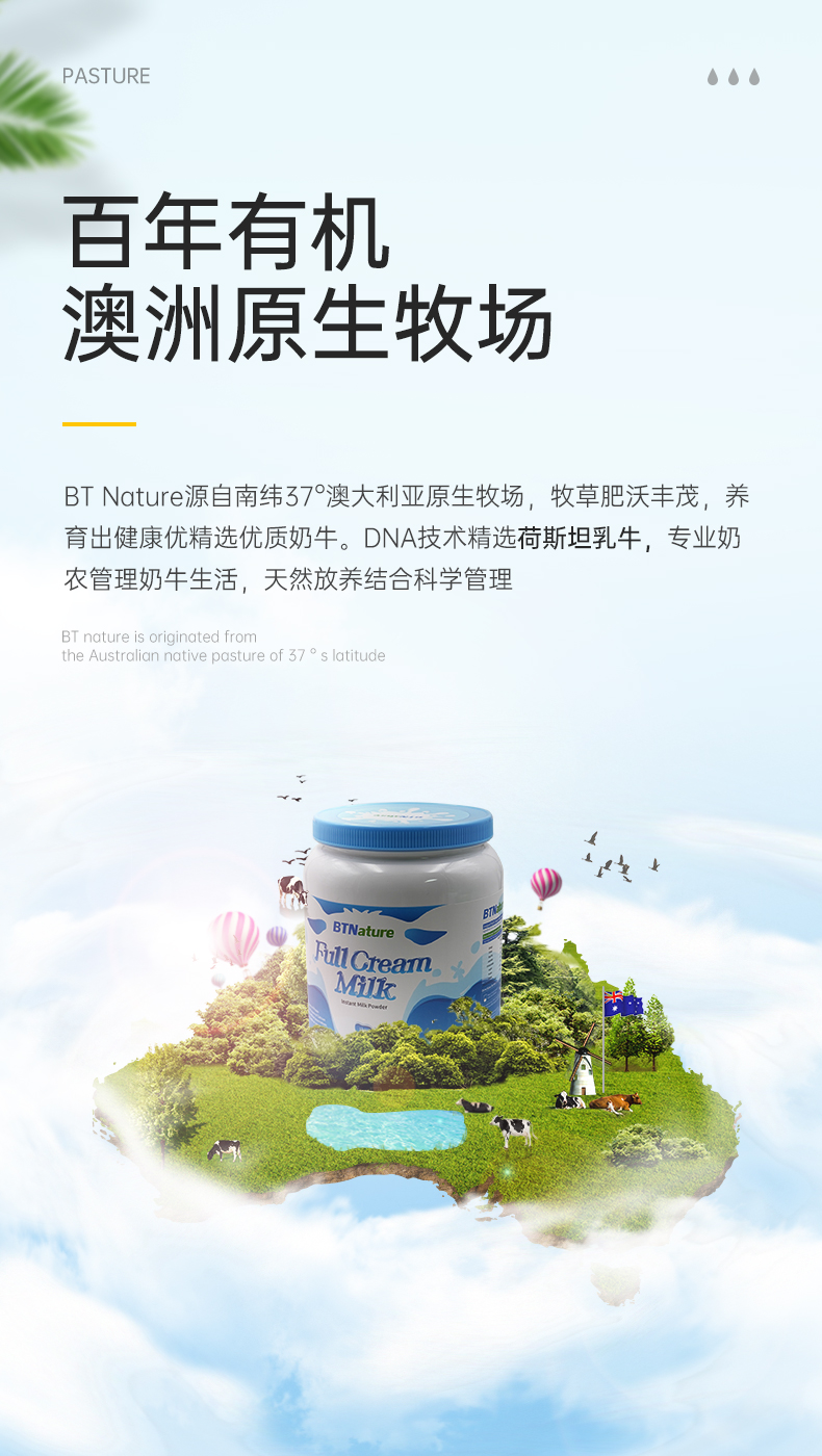 这款澳洲 BTNature高钙奶粉,在澳洲南纬30°-50°的拥有自家的黄金牧场,臻选纯种荷斯坦乳牛,采用全球领先的湿混工艺,也就是在新鲜奶源还是液体状态下,加入各种营养元素进行均匀混合后,将直接进行鲜奶低温喷雾干燥、喷粉,全程无菌化。