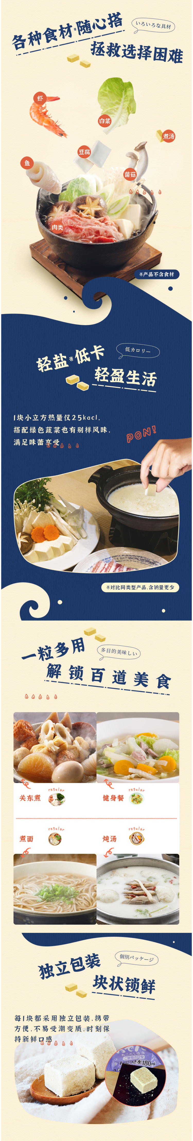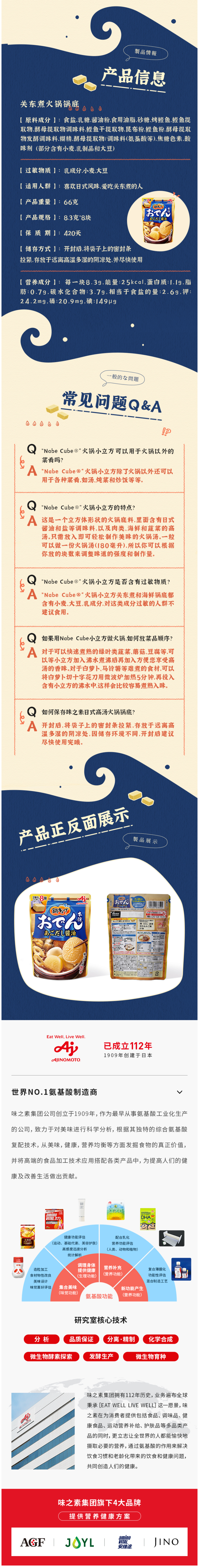 这款味之素日式关东煮火锅汤底,日本进口,以优质鲣鱼为汤底,同时添加昆布等鲜味食材搭配,每一口汤都浓郁鲜香。低盐轻卡,1块小立方热量仅25kacl。1人食只需1块,一包有8颗火锅小立方,加入食材煮食即可。