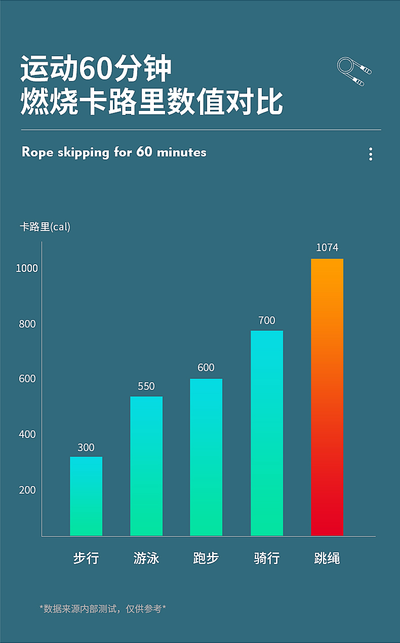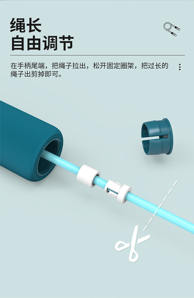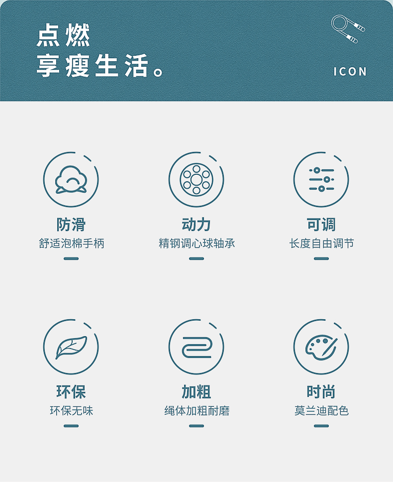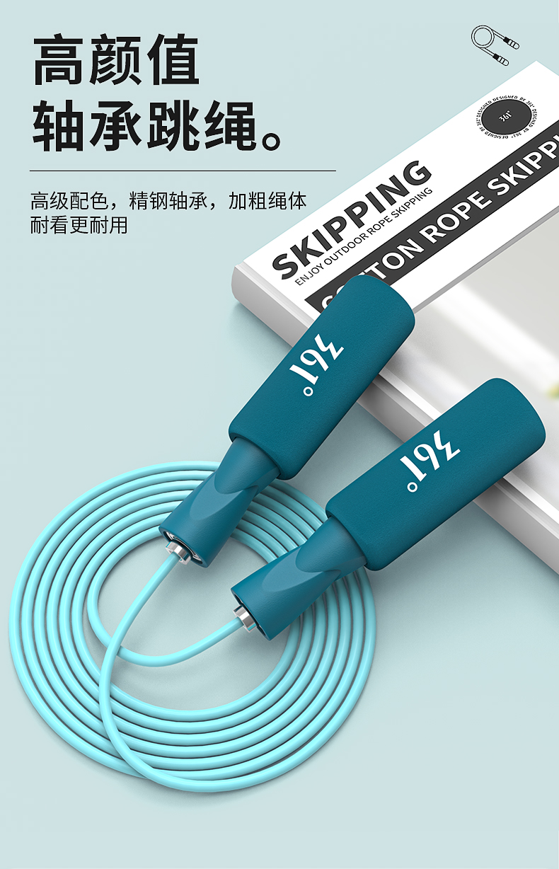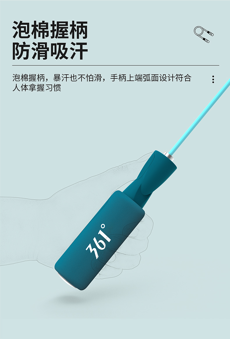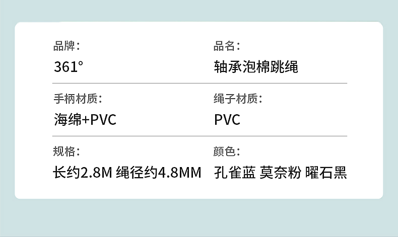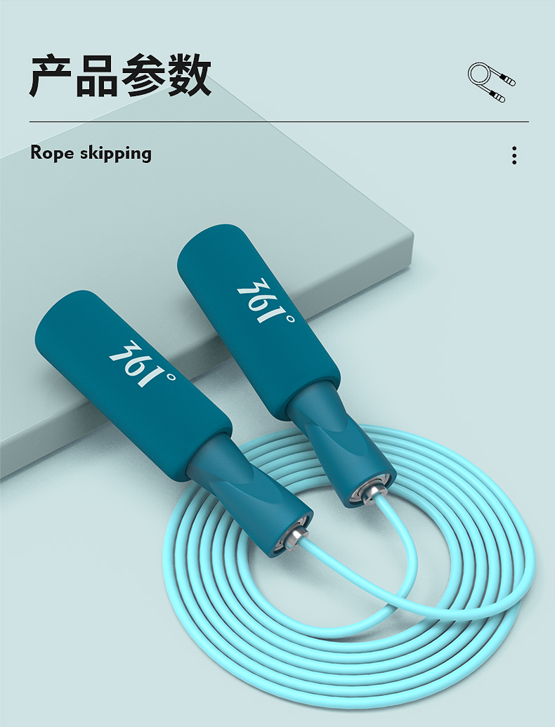 这款361度 健身燃脂跳绳,手柄长度 13cm、绳子长度 2.8m、整重140g,绳子材质使用PVC。防滑舒适泡棉手柄,上端弧度设计符合人体拿捏习惯,强吸汗暴汗也不会滑手。加粗PVC绳体,耐磨不易断,绳字的长度也可自由调节。