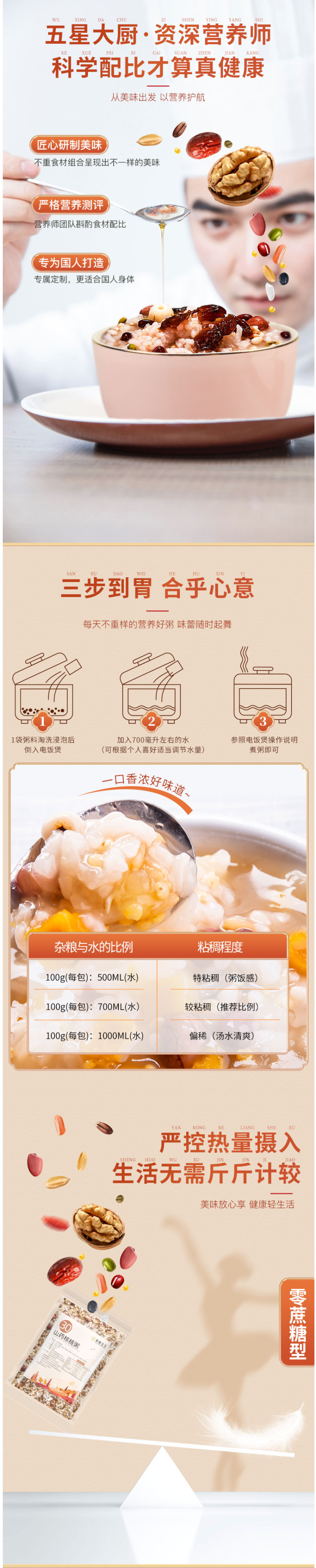 食材:黑龙江糙米、山西黄小米、山西黑小米、山西绿小米、山西白小米、东北黑豆、湖北山药干、黑龙江红小豆、河南花生、山西芸豆、新疆葡萄干、江西豇豆、东北青豆、河南麦仁、贵州红米、云南绿豆、宁夏红枸杞、甘肃荞麦米、内蒙黑麦仁、河南黑芝麻、西北青稞、广东紫薯干、河南南瓜干、安徽红薯干、新疆红枣干、四川银耳、甘肃百合、河北核桃、河南南瓜干、河北包菜干、河北胡萝卜干、山东重瓣红玫瑰、山东苹果干、云南黑花生、河南菊花瓣、广西芋头干、杜良大米、江苏白糯米、山西燕麦米、东北玉米粒、东北高粱米、陕西黑米。
