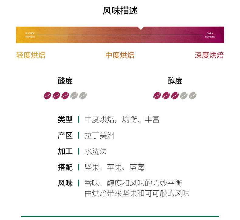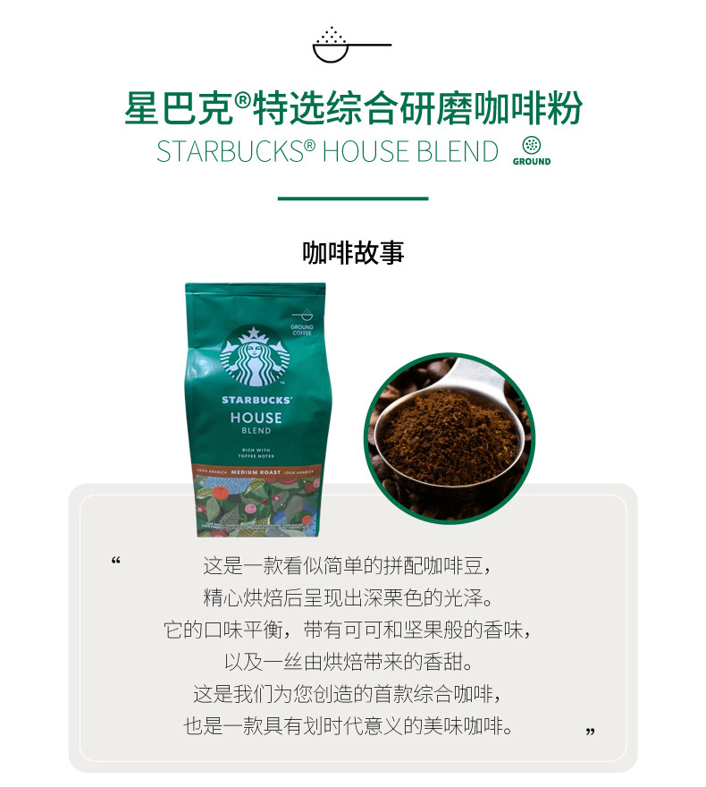 这款星巴克中度烘焙研磨咖啡粉,葡萄牙产,采用拉丁美洲的优质咖啡豆,搭配牛奶巧克力、肉桂、坚果、焦糖等辅料,经过长时间低温烘焙而成,充分释放出咖啡独有的香味,口感浓郁,加工是用水洗法或半水洗法。