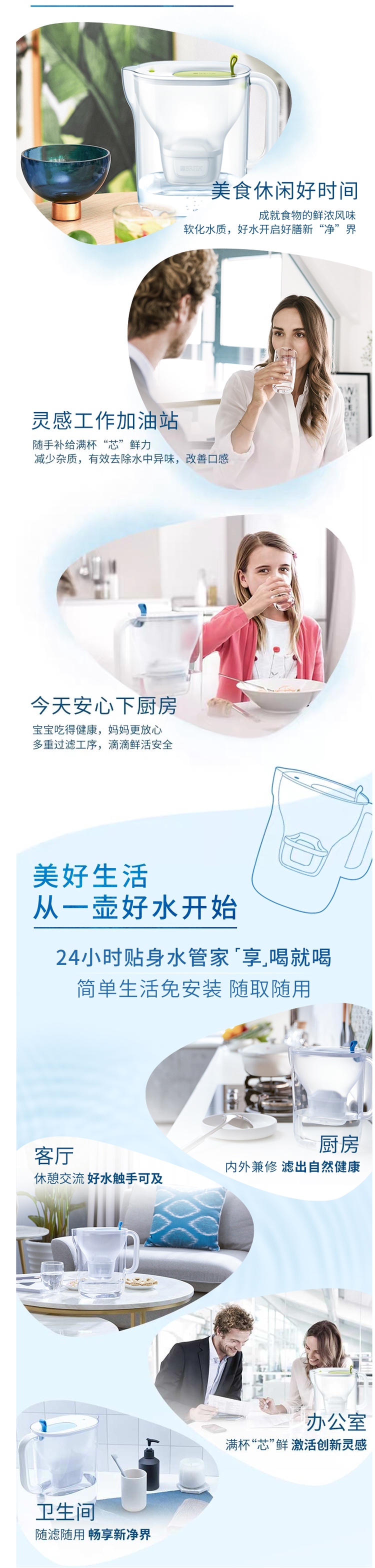 德国的Brita碧然德是过滤水系统行业的领头羊,这款Style设计师系列滤水壶容量为3.5L,每次可过滤2L,采用BPA-Free无毒塑料,防滑手柄,橡胶软脚,指压式开闭注水口,不用打开上盖就可加水,使用比较方便。