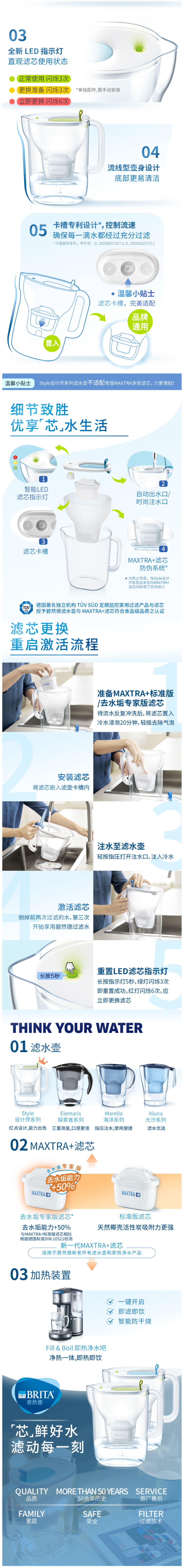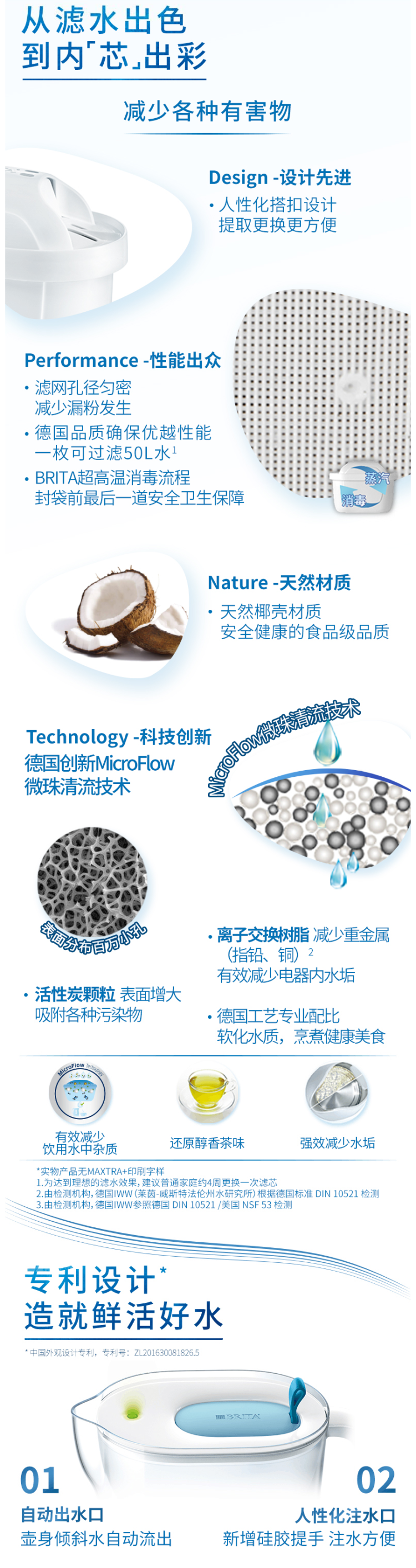 滤芯方面,德国原装进口的Maxtra+,比传统的一代滤芯在过滤能力方面增加了20%,还改良了MicroFlow Technology 微流控技术,使水的味道比以往更好。滤芯中所含的活性炭,能有效过滤水中的重金属、水碱、杀虫剂、有机杂质、氯气和异味。