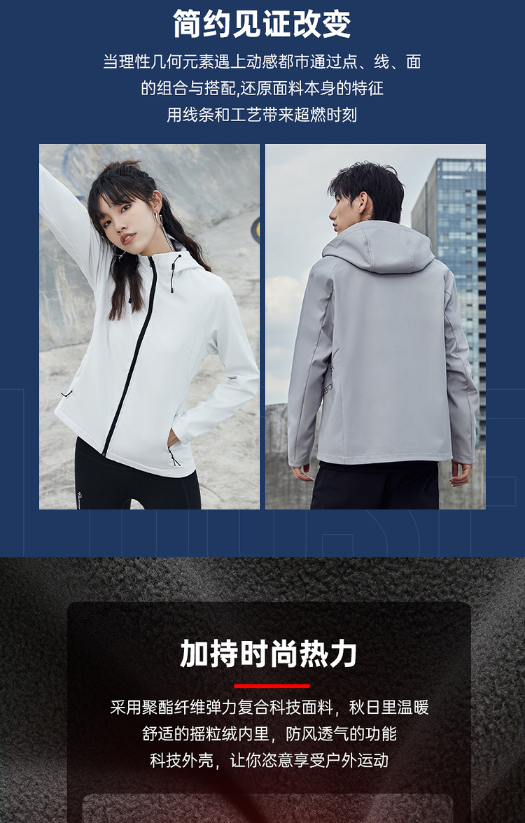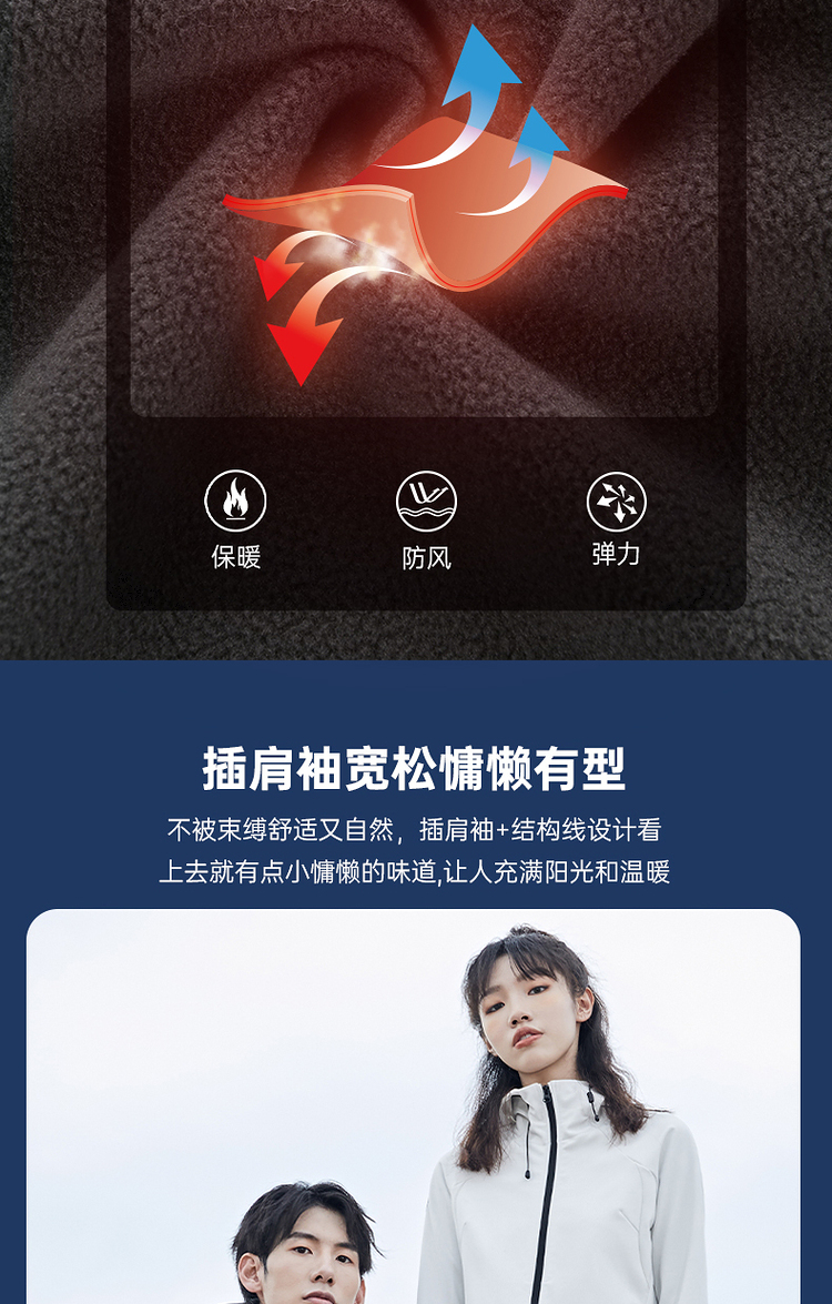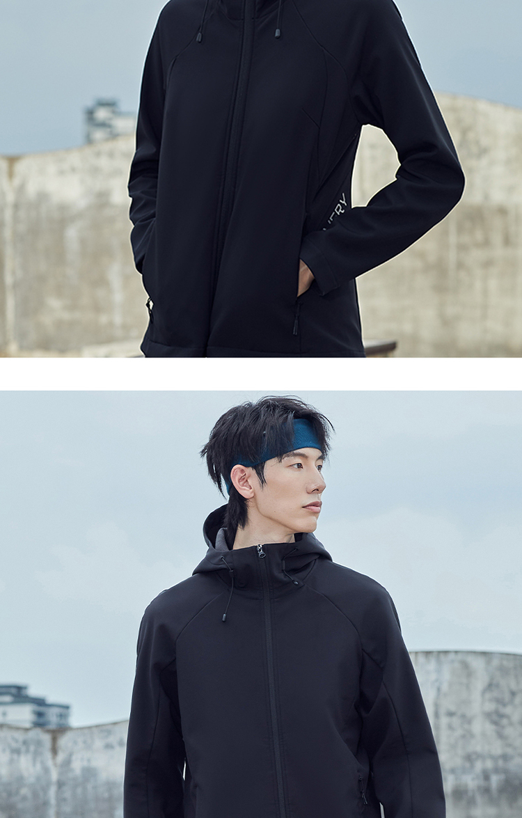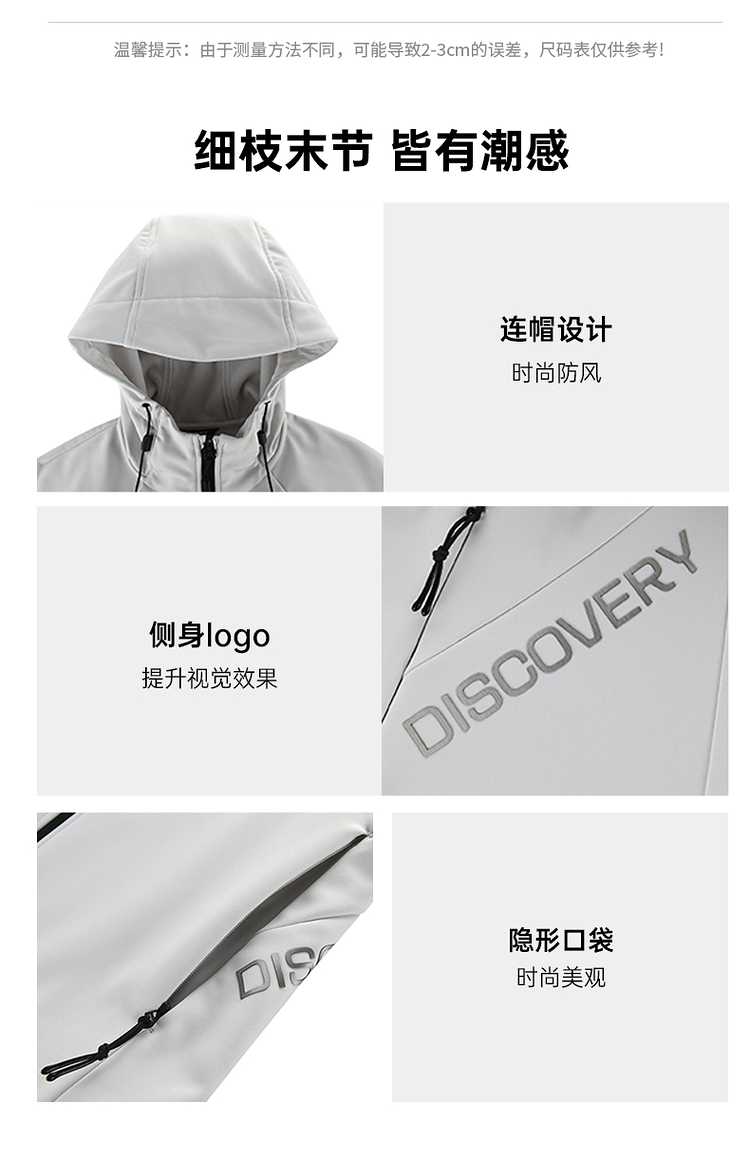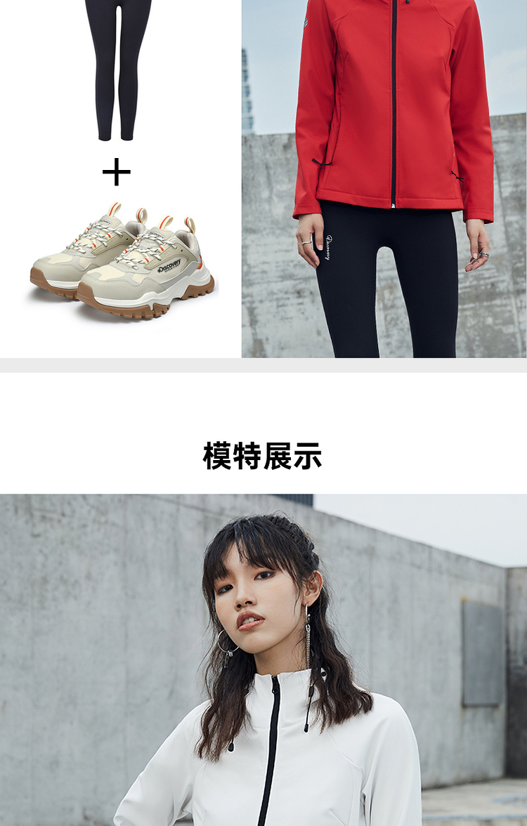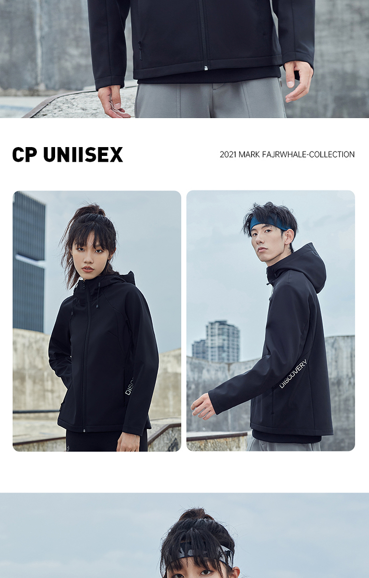 这款Discovery 户外 软壳外套,外层面料集防风防泼水、轻量透气于一体,相比硬壳(冲锋衣),具有更加良好的透气性,面料中可以混入10%的弹力纤维,弹力伸展,即使运动中也可以提供很好的舒适性,而且衣服摩擦时的声音会小很多,穿着更舒适。