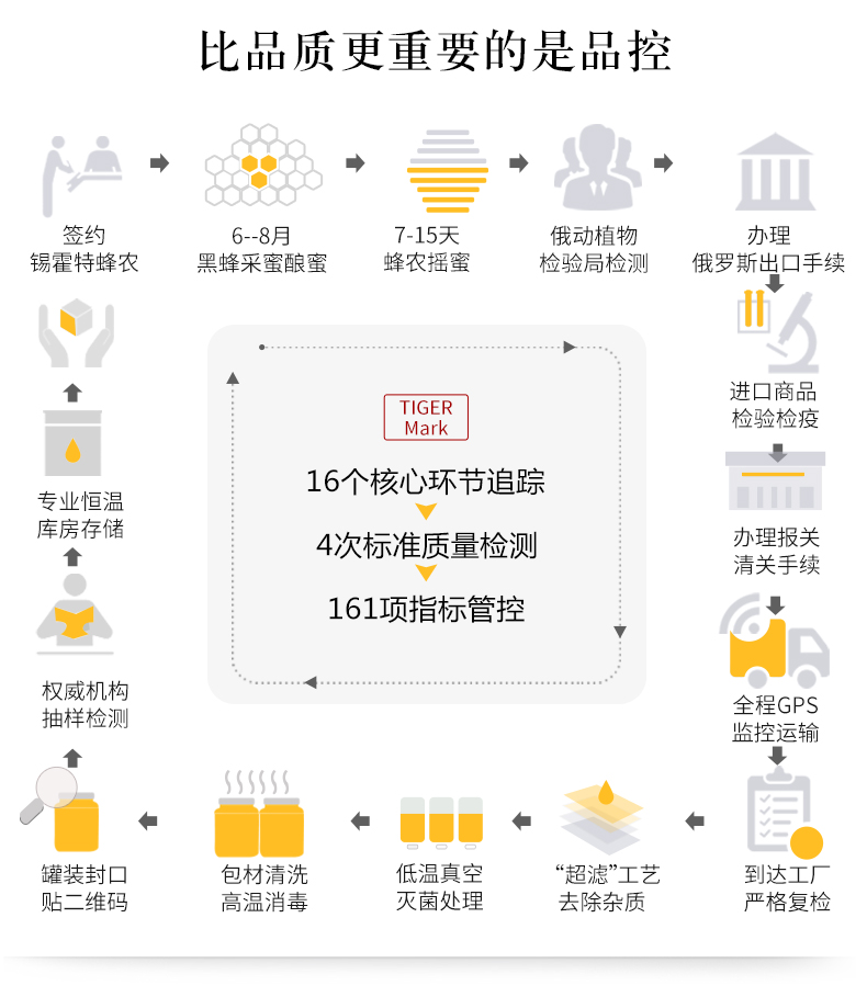 6-8月黑蜂采蜜酿蜜、7-15天蜂农摇蜜、俄动植物检验局监测、办理俄罗斯出口手续、进口商品检验检疫、办理报关清关手续、全程GPS监控运输、到达工程严格复检、“超滤”工艺去除杂质、低温真空灭菌处理、包材清洗高温消毒、罐装封口贴二维码、权威机构抽样检查、专业恒温库房存储、最后售卖。