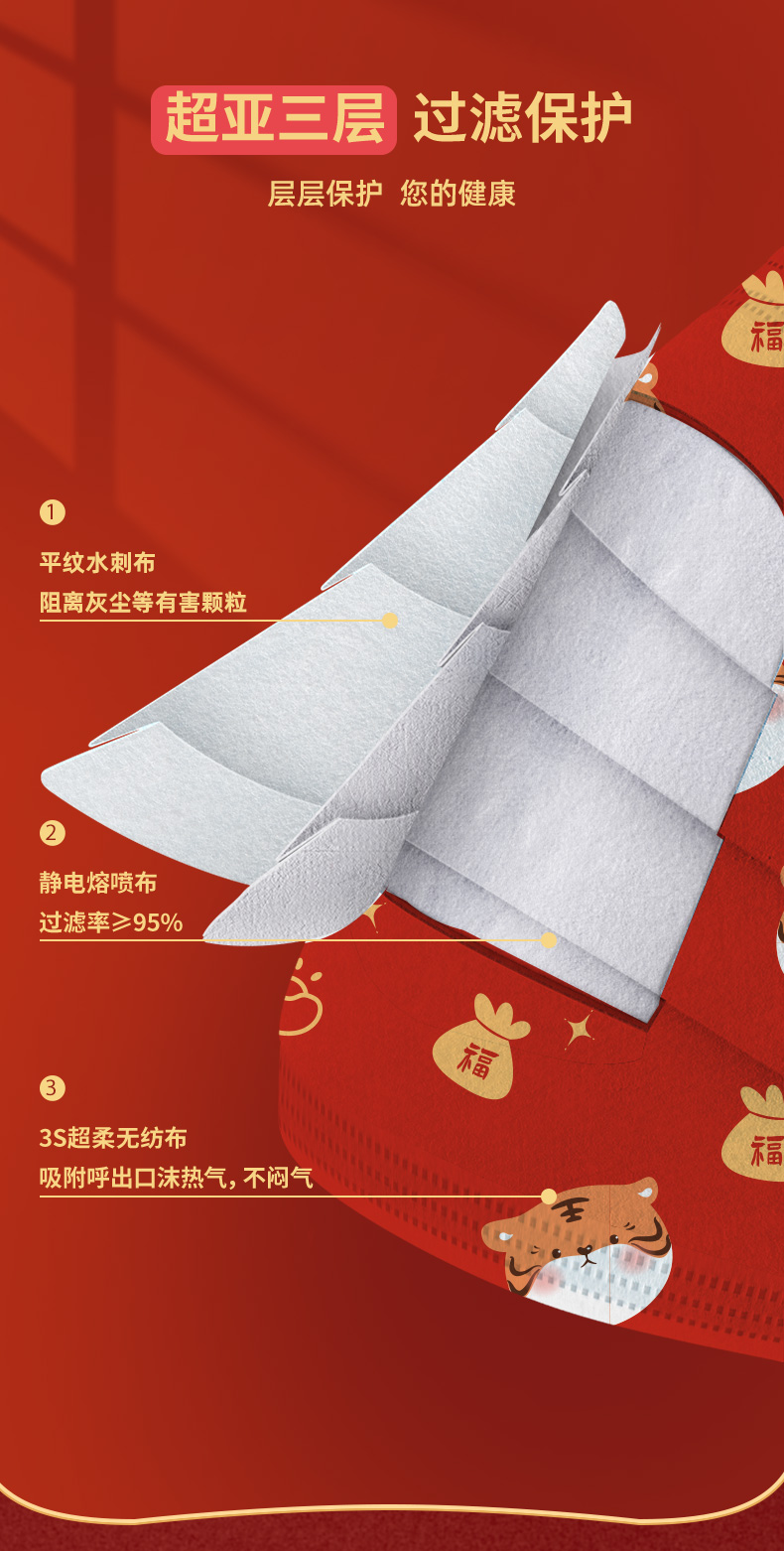 天猫虾选旗舰店19.9元,可领10元优惠券,实付9.9元到手,新年限定款的虎年医用外科口罩,规格:20只。采用无纺布材料,三层防护,亲肤无异味,柔软又贴心,喜庆印花,安心佩戴健康过新年。佩戴舒适,高防护,高颜值,虎年限定设计,鸿运正当红,添加原创虎宝宝元素,满满仪式感。