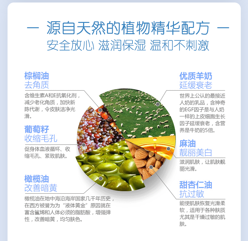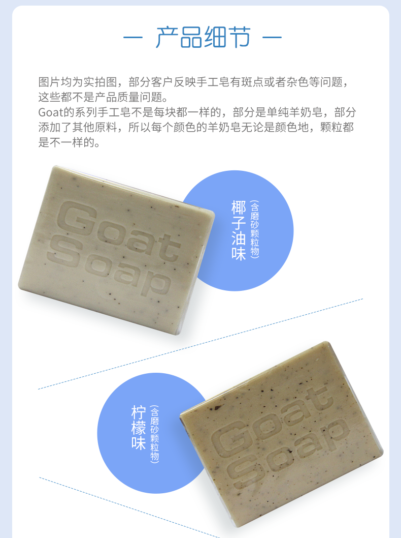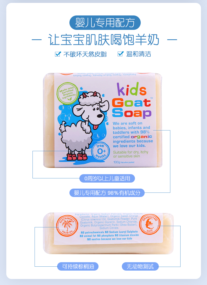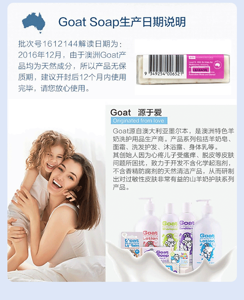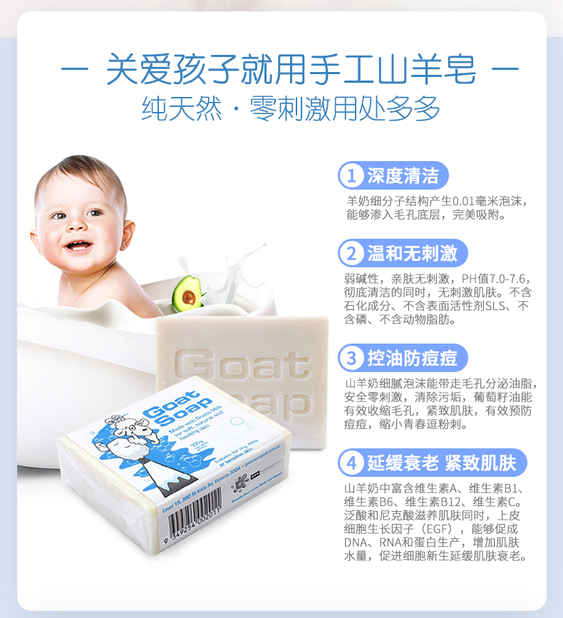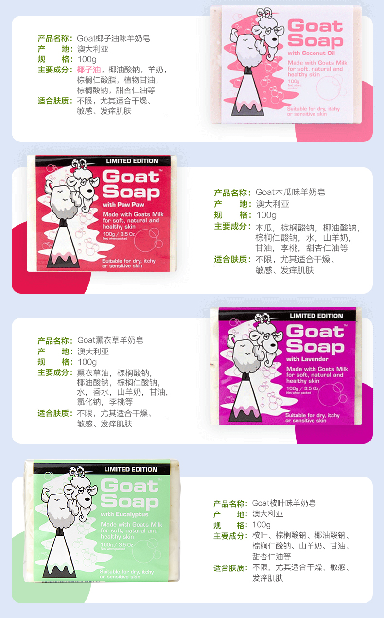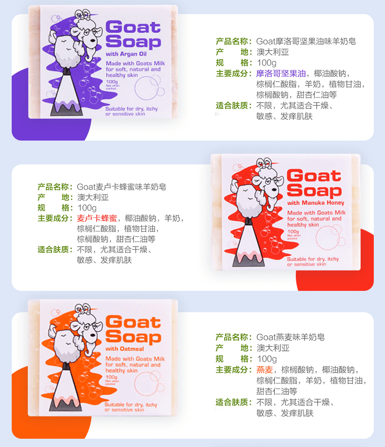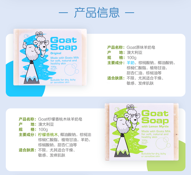 这款Goat soap 有机山羊奶皂,选用澳洲农庄新鲜山羊奶,融合5种芳疗常用的冷压植物油:甜杏仁油,葡萄籽油,蓖麻油,棕榈油和橄榄油(非常温和滋润的成分)。30%以上的新鲜山羊奶,搭配50%的冷压橄榄油再加上20%其他植物油的绝妙黄金比例,让羊奶皂的效用发挥到最大化。